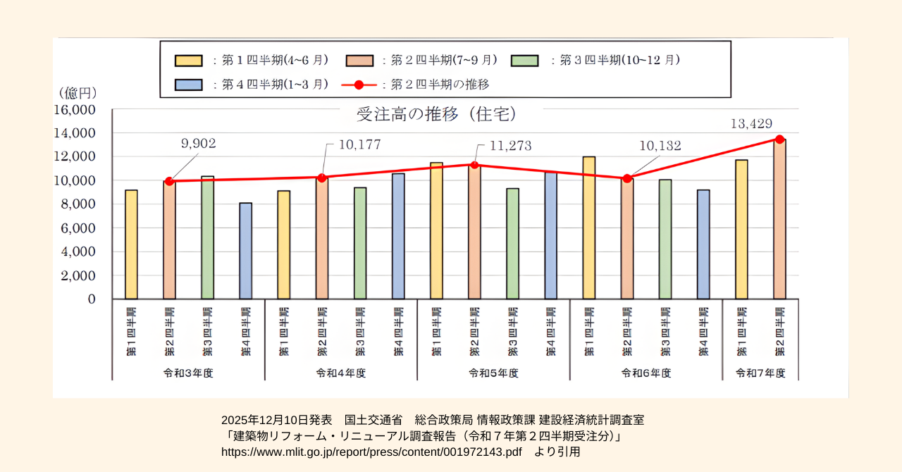 「建築物リフォーム・リニューアル調査報告(令和7年第2四半期受注分)」から、令和7年度第2四半期の受注高の合計は、4 兆 5,495 億円、そのうち、住宅に係る工事の受注高は 1 兆 3,429 億円で、同 32.5%増加したことが分かりました。