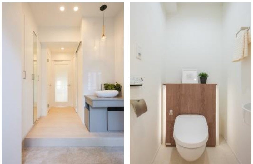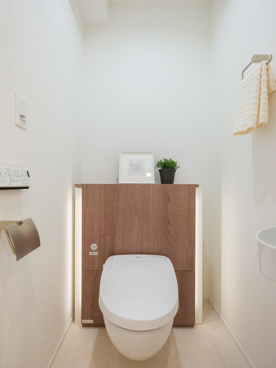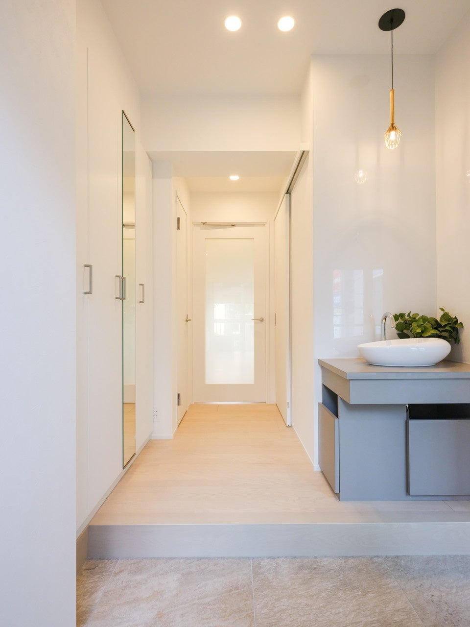 玄関入ってすぐには、機能性を持たせたミニマムな造作手洗いを設置しました。ペーパータオル用のダストボックスや、ペーパータオル置きも造作家具の中に埋め込んでいます。トイレの便器は壁掛スタイルのフロートトイレを採用し、そのデザイン性だけでなく掃除のしやすさも特徴です。