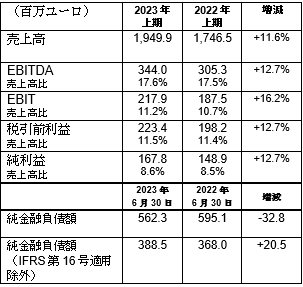 · 売上高 2022年上期比11.6%増の1,949.9百万ユーロ(前年同時期の為替レート基準で12.3%増)
