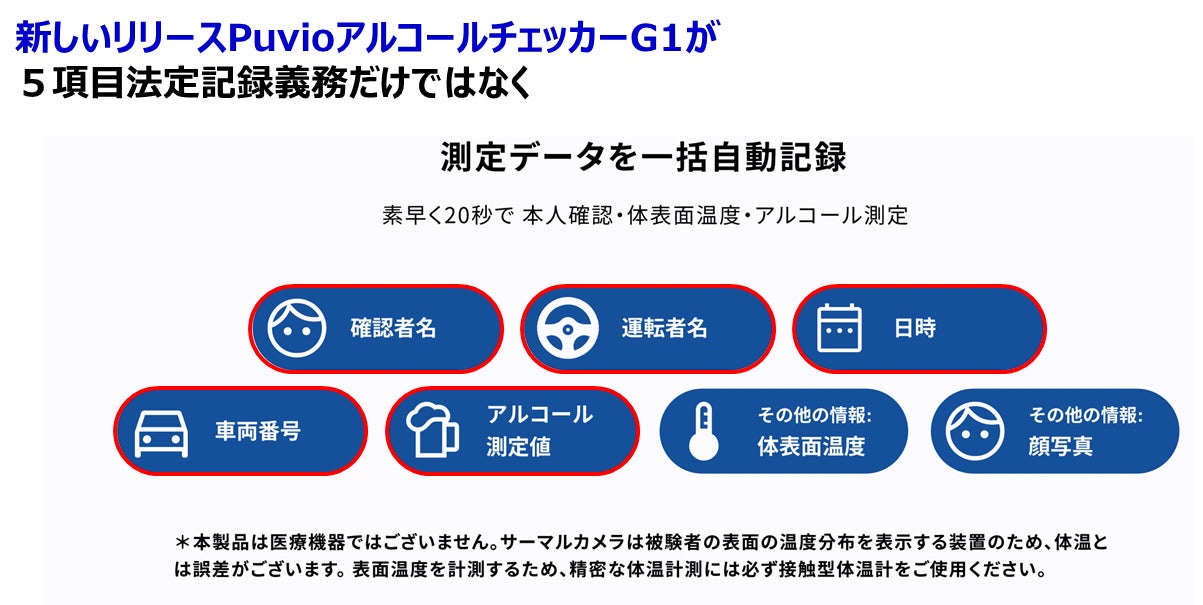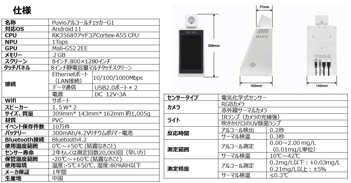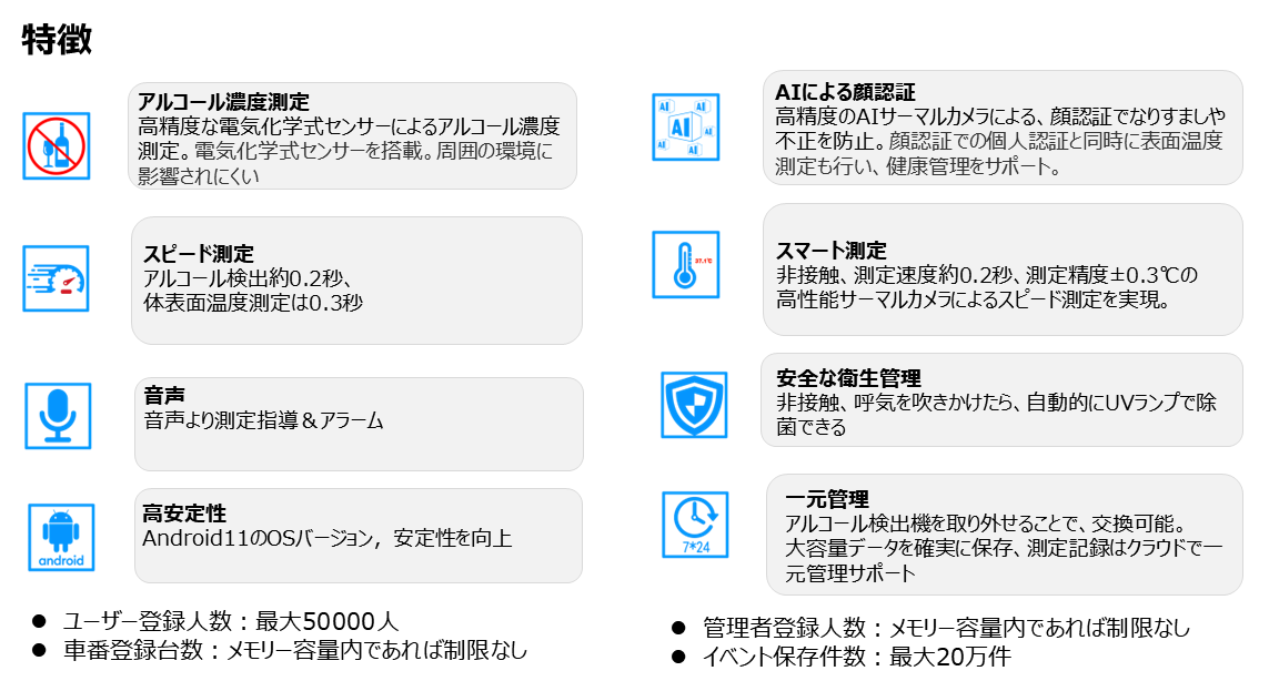 「Puvioアルコール チェッカー」の最大の特長は、①コンパクトな外観、②電気化学式センサーを搭載した高機能モデルで、アルコール測定時間はわずか0.2秒、③AIによる顔認証(高精度のAIサーマルカメラによる顔認証でなりすましや不正を防止。顔認証での個人認証と同時に表面温度を0.3秒で測定)、④測定データは一元的にクラウド上に保存管理、⑤センサー寿命は他社製品に比べ約2倍(2年 or 測定回数2万回のいずれか早い方)、⑥最大50,000人までの顔登録が可能、⑦直行直帰用の携帯型モデルを2種用意(半導体式ガスセンサー、電気化学式センサー)、⑧音声によるガイダンスあり、など。