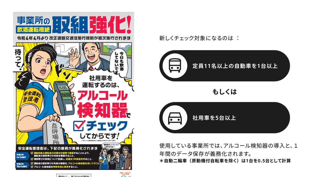 2022年4月1日から道路交通法が改正され、白ナンバーのアルコールチェックが義務化されます。これまでアルコールチェックが必要なのは運送業などの「緑ナンバー」のみでしたが、今回の改正で「白ナンバー」も対象となったため、殆どの事業者が対象となります。
