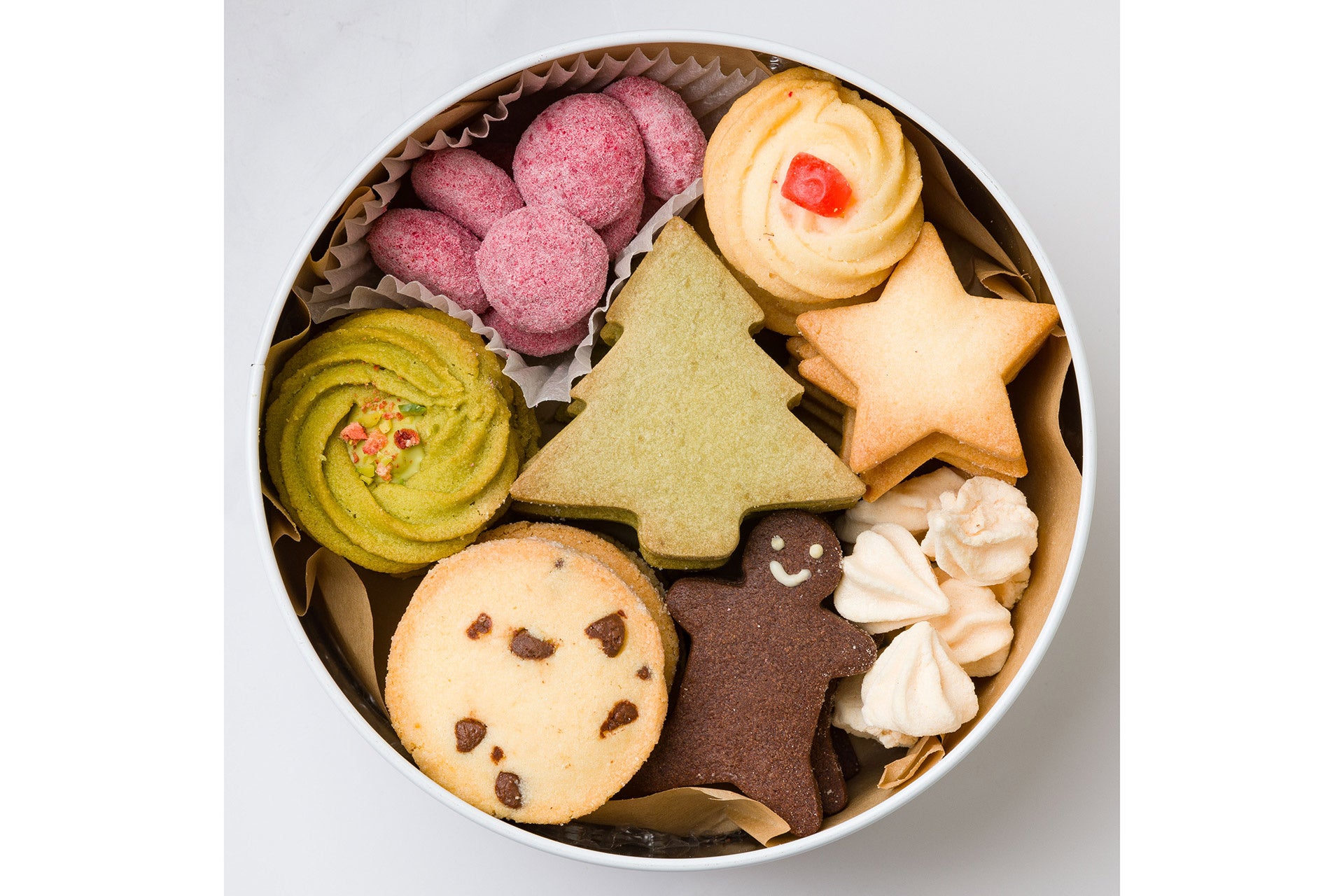 メレンゲクッキー、サブレ抹茶(ツリー)、サブレショコラ(人)、サブレバニラ(星)、ディアマン チョコチップ、ヴィエノワ ドレンチェリー、ブールドネージュ ベリー、ロミアスクッキー抹茶
