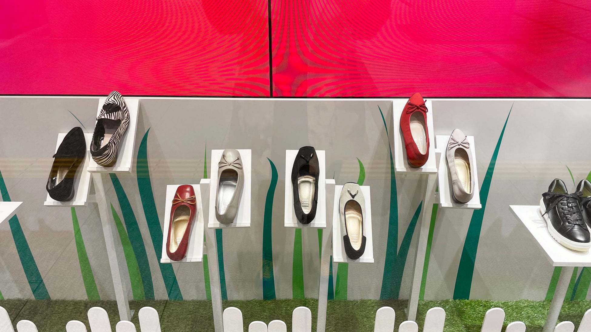爽やかなガーデンをイメージした背景と什器を使い、2022年春夏イチオシのパンプスとスニーカーをディスプレイしています。