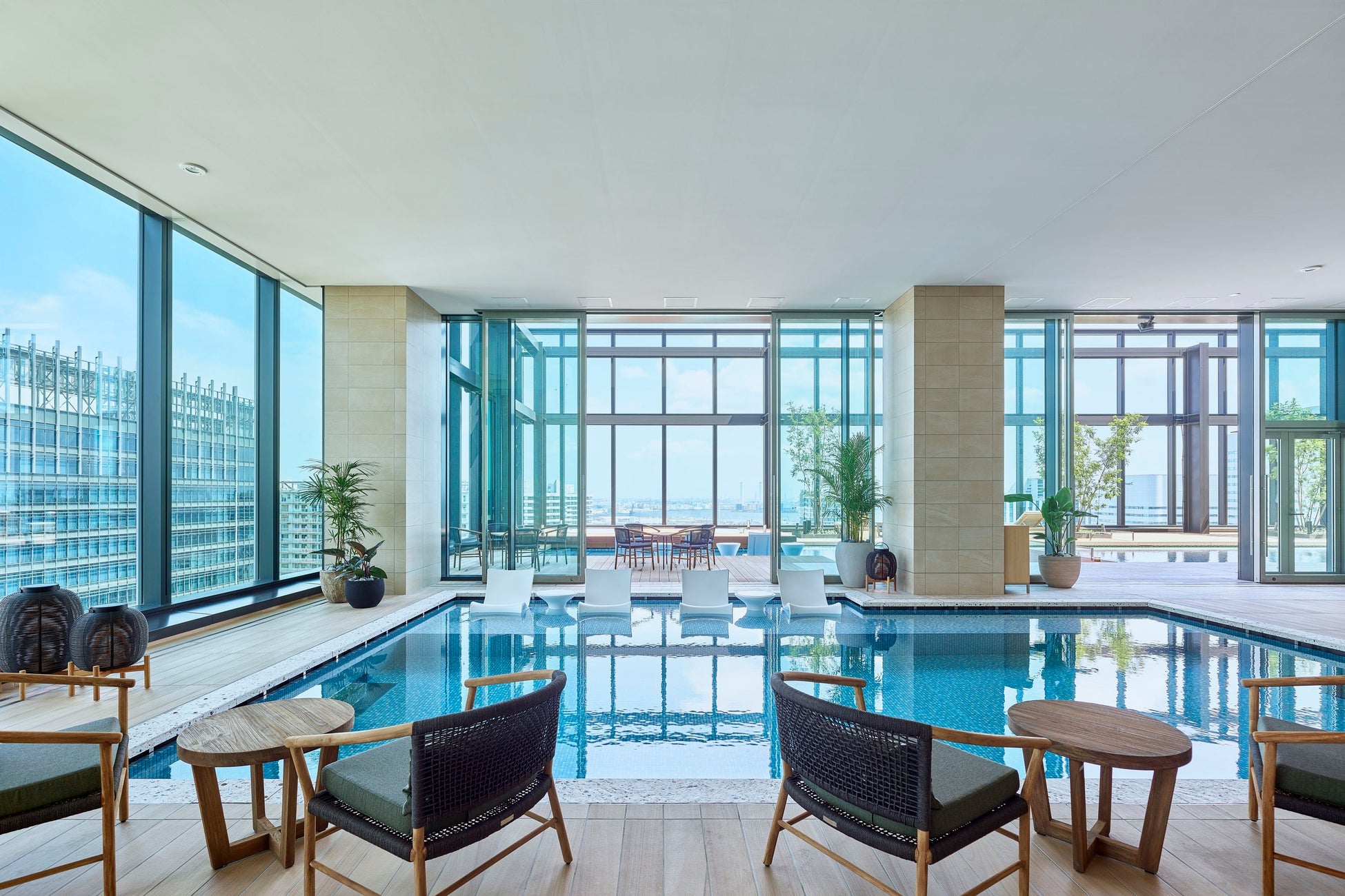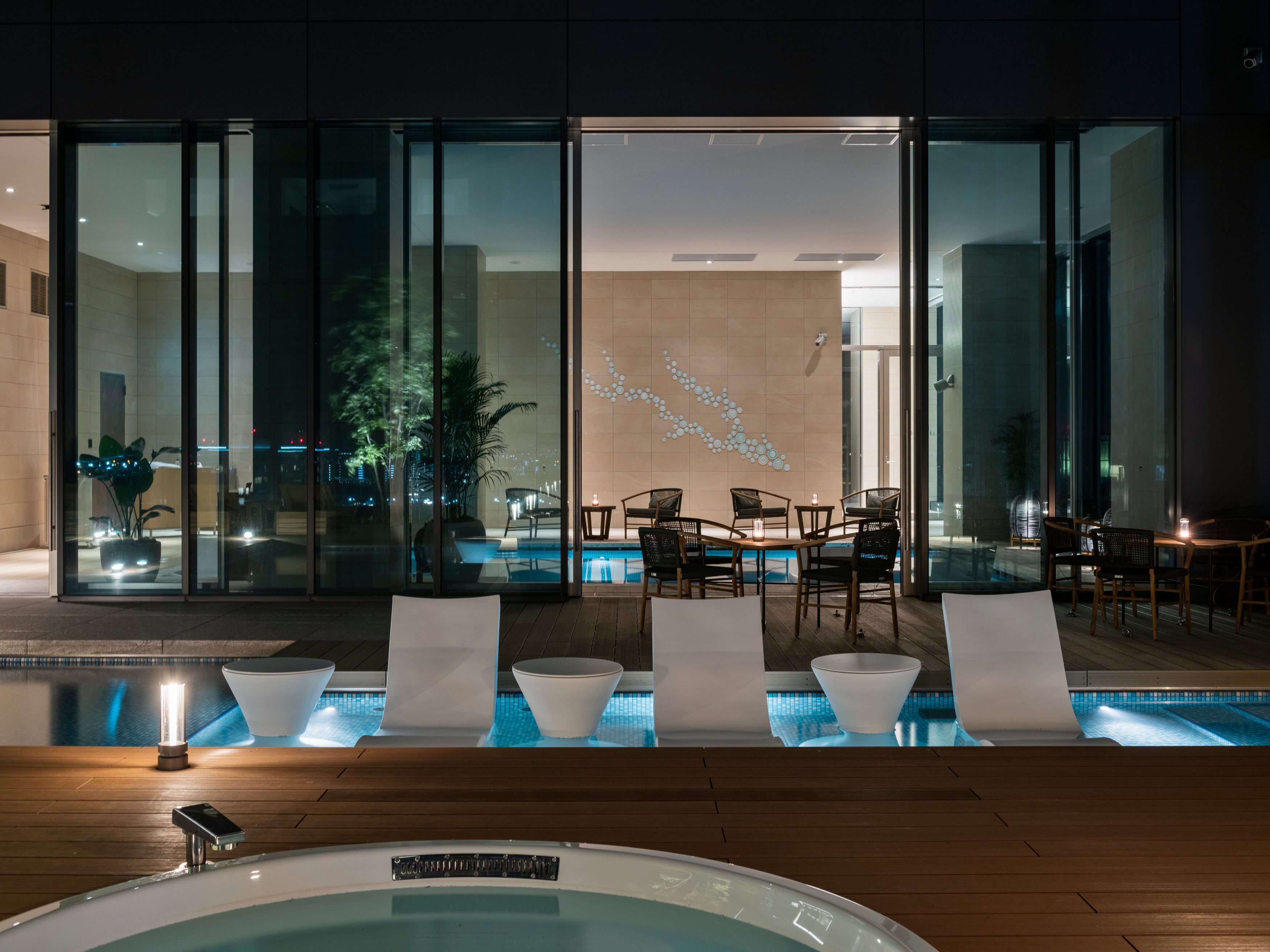 ホテルのアイコニックとも言えるスカイプール「sky pool LA MAGNOLIA(スカイプール ラ マグノリア)」は、三井ガーデンホテルズとして初の設置となるプールで、屋内(全長8.6m、深さ1.2m)・屋外(全長9m、深さ0.5m)の2ヶ所にあり、屋外にはジェットバスも設置されています。