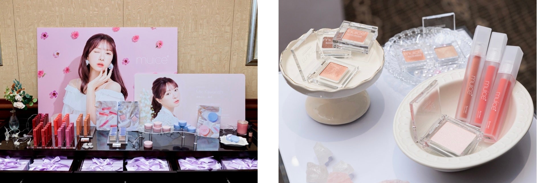 美容系動画クリエイター・かわにしみきがプロデュースする「muice」のセミナーでは、3月から先行発売されている「muice」がローンチされてからの心境やブランドに込めた想いを語るトークショーと、第二弾として発売された3アイテムを使ったメイクショーが行われました。