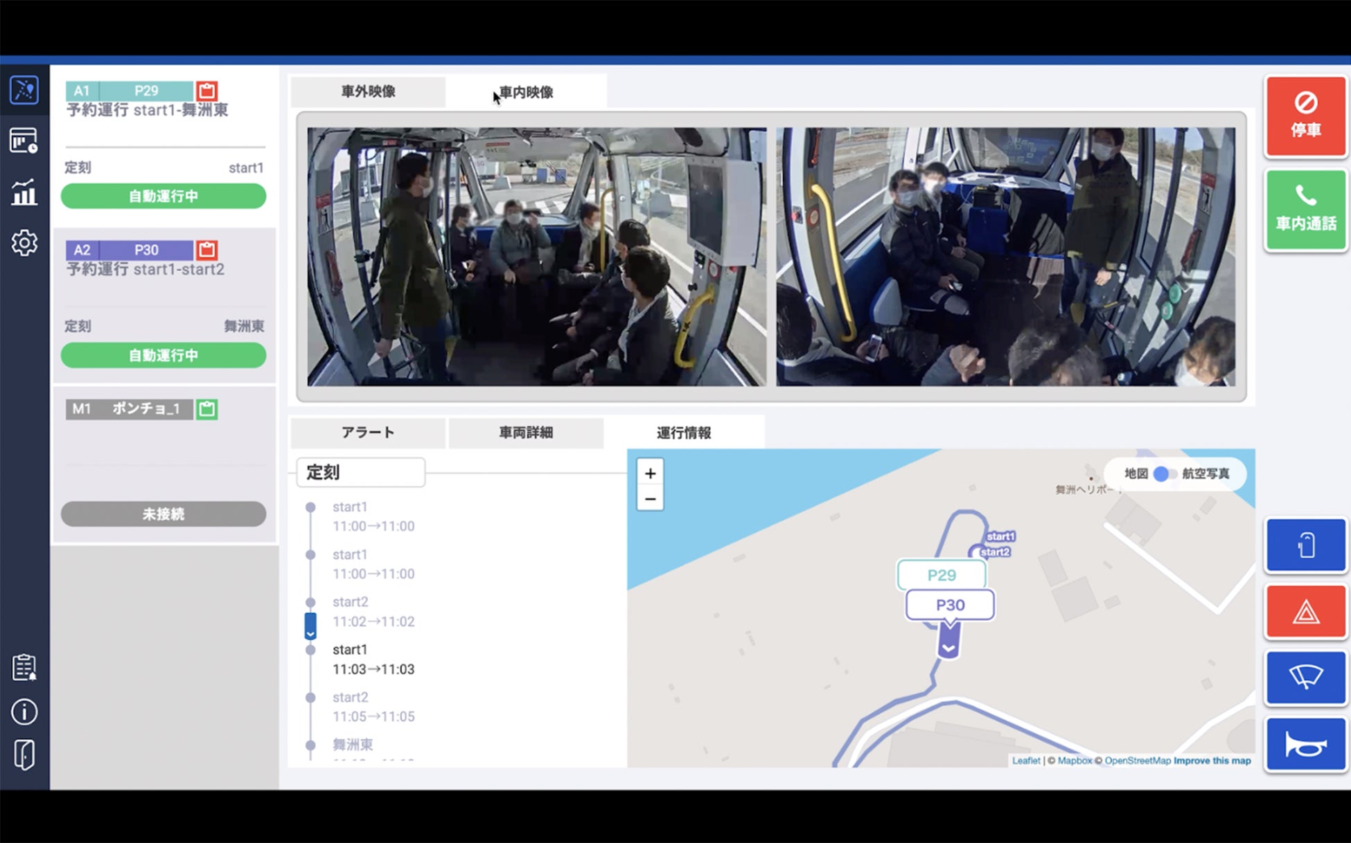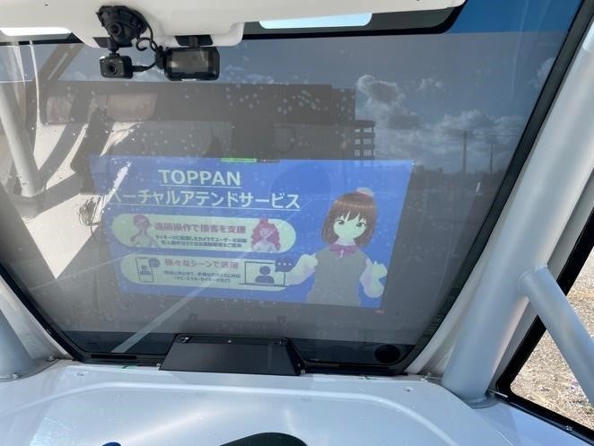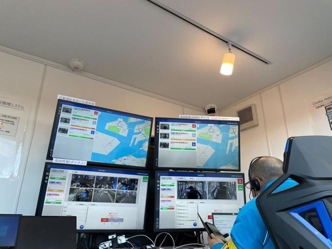 テストコースおよび公道で実施した実証では、「Dispatcher」と、「NAVYA ARMA」および先進モビリティ株式会社が改造した自動運転車両「ポンチョ」を接続し、Osaka Metroの遠隔監視者一人が、「Dispatcher」を用いて2車種・計3台の自動運転車両の遠隔監視を行う他、緊急時を想定して遠隔地から「NAVYA ARMA」の停止や発車指示を行う検証を実施しました。また、将来的な自動運転レベル4での無人自動運転サービスを見据えて、添乗員がいなくても乗客が安心して利用できるように、凸版印刷株式会社のアテンドサービスを用いて、AGC株式会社のガラス製透明スクリーン「Glascene」※2を貼った「NAVYA ARMA」の窓ガラスにアバターを投影し、アバターを使って遠隔地から車内案内を行う実証も行いました。