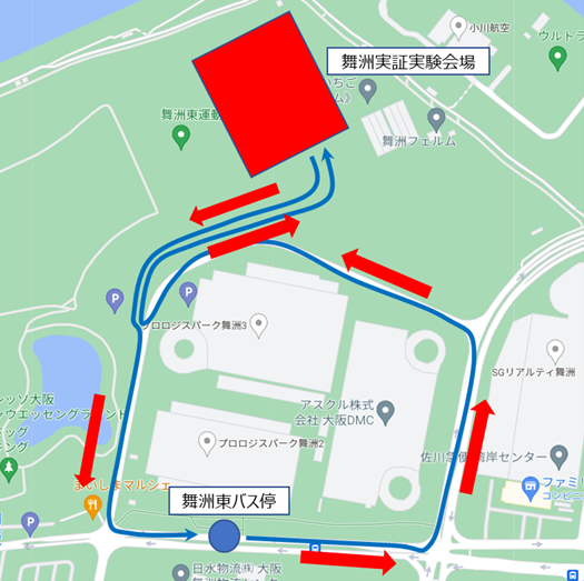 舞洲スポーツアイランド内「舞洲実証実験会場」内のテストコース(400m/周)(大阪市此花区北港緑地2丁目1)および周辺公道(舞洲東バス停⇔舞洲実証実験会場)
