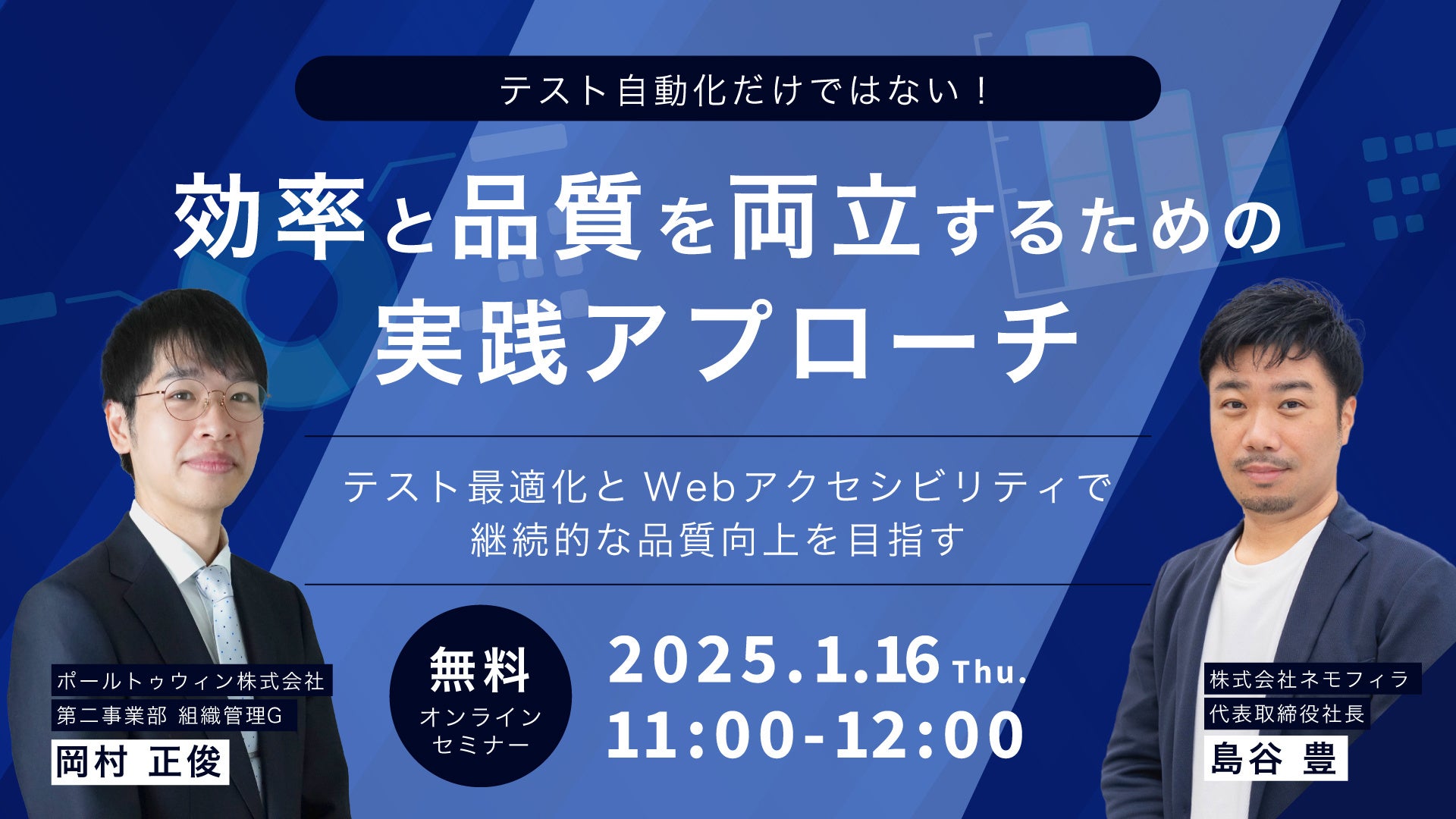 ポールトゥウィン株式会社(本社:愛知県名古屋市、代表取締役 CEO:橘 鉄平、代表取締役 COO:志村 和昭、以下「ポールトゥウィン」)は、2025年1月16日(木)に無料オンラインセミナー「テスト自動化だけではない!効率と品質を両立するための実践アプローチ」を開催いたします。ソフトウェアやWeb開発における品質管理の課題が複雑化する中、テスト自動化にとどまらない新しい視点からのアプローチを解説します。また、ゲストスピーカーとして、Webアクセシビリティの専門家である株式会社ネモフィラの代表取締役社長 島谷豊氏をお迎えし、2024年4月に施行された改正障害者差別解消法への対応を踏まえた具体策を共有いただきます。