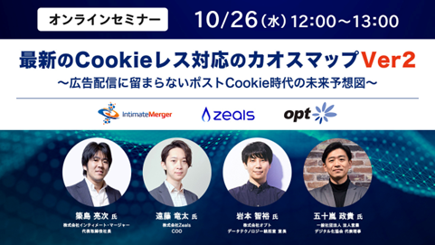 国内最大級パブリックDMPを提供するデータプラットフォームカンパニーの株式会社インティメート・マージャー(本社:東京都港区、代表取締役社長:簗島 亮次、以下当社)は、本年10月4日(月)より開始している「2022年デジタルの日」を記念したX-Tech(クロステック)セミナー企画の第2弾として、株式会社オプト(本社:東京都千代田区、代表取締役社長 CEO:栗本 聖也、以下、オプト)と株式会社Zeals(本社:東京都目黒区、代表取締役:清水正大、以下ジールス)と3社共催セミナー「最新のCookieレス対応のカオスマップ Ver2 〜広告配信に留まらないポストcookie時代の未来予想図〜」を本年10月26日(水)に実施することをお知らせします。