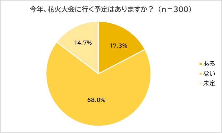 「今年、花火大会に行く予定はあるか?」訊いたところ、7割弱が「ない」(68.0%)、「ある」は2割弱(17.3%)、「未定」も1割超(14.7%)となりました。