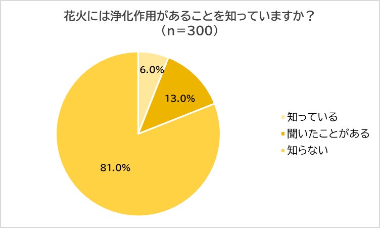 続いて、「花火には浄化作用があることを知っているか?」訊いたところ、8割(81.0%)が「知らない」と回答し最多に。「聞いたことがある」は1割超(13.0%)、「知っている」はわずか(6.0%)となり、ほとんどの人が知らないことがわかりました。