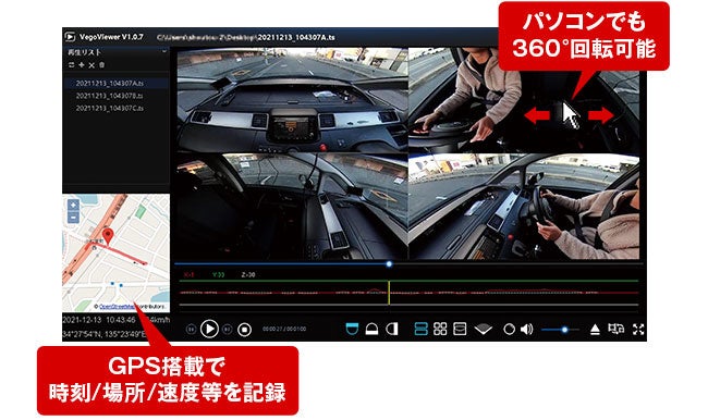 パソコン上でも録画映像を様々な表示アングルでの再生ができます。専用ビューワーはmicroSDカードを本体でフォーマットするとカードにインストールされます。