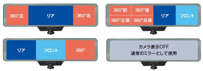 3カメラ分割画面やフロント/リアカメラ全画面表示も可能。画面表示をOFFにすれば通常のミラーとしても使用できます。