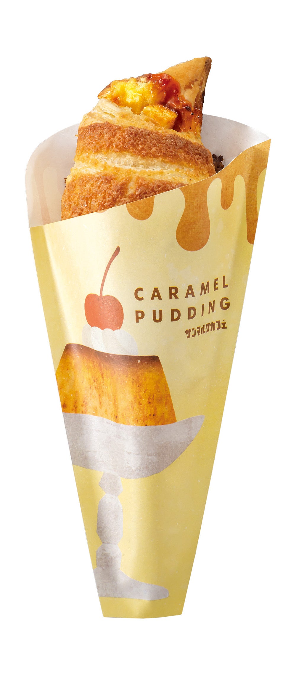 「プリン」に着目し、今回のために開発したプリン風味のチョコレートを、サクサクのクロワッサン生地で包み込みました。更にカスタード、キャラメルシュガーを加え、味わいだけでなく、中からじゅわっと溢れる なめらかな食感や香りもカラメルプリンに近づけました。上部にはカラメルソースとサクサク食感のアーモンド生地を絞り、キャラメルシュガーをかけて焼き上げることで、焦がしカラメルのような深い味わいとパリッとした食感をお楽しみいただけます。