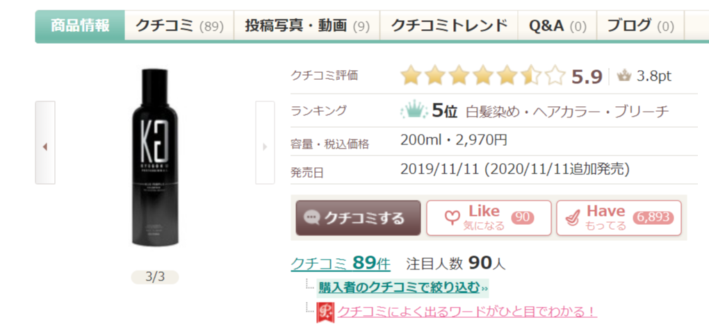 アットコスメ2021年10月に掲載を開始したカラーシャンプーは3か月集計のランキングにて白髪染め・ヘアカラー・ブリーチ部門で5位にランキングイン。