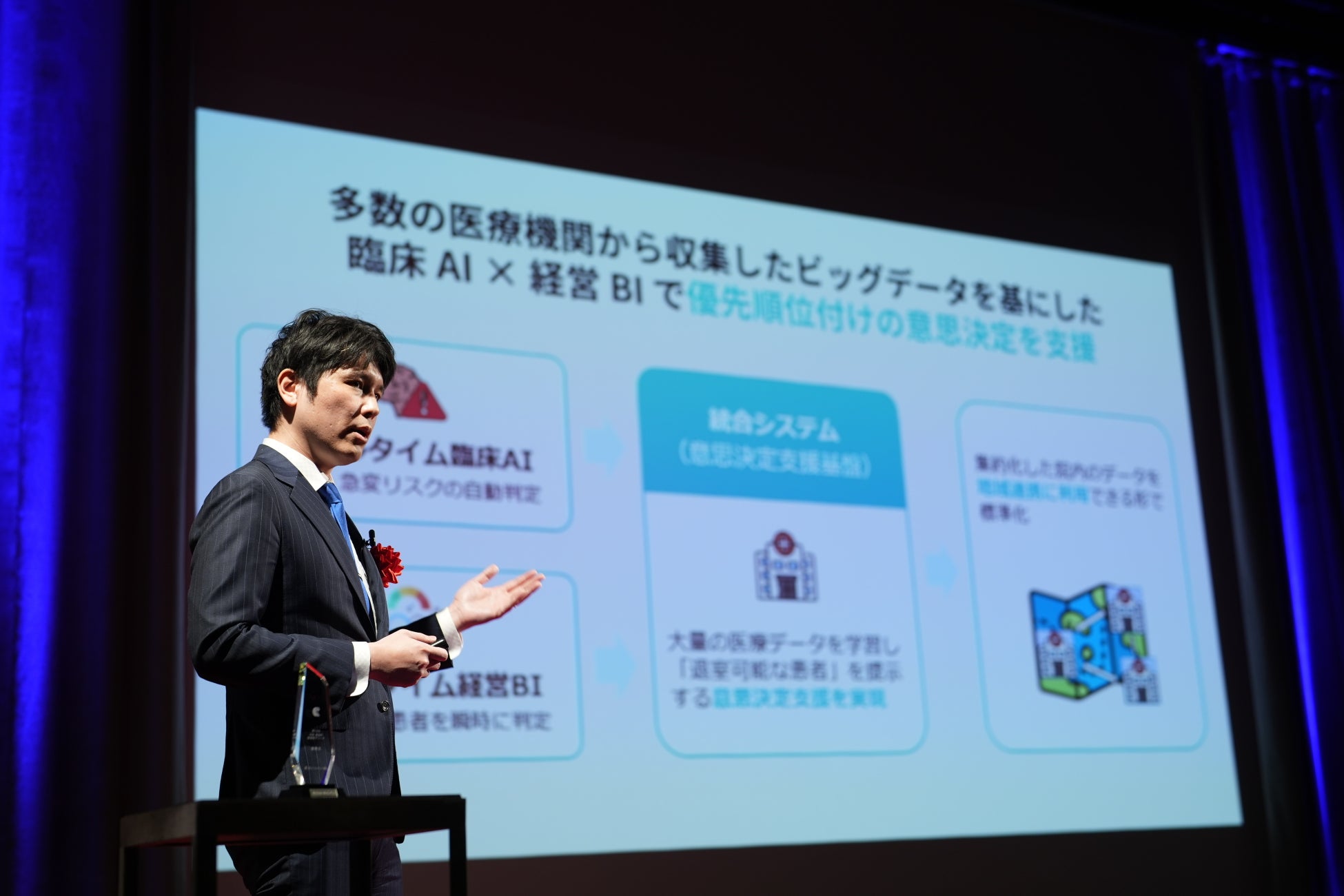 AI技術を活用して医療従事者の業務を効率化し、リアルタイム診療支援や、データサイエンス業務、臨床研究支援、大規模ICUデータベースの提供を行っている。