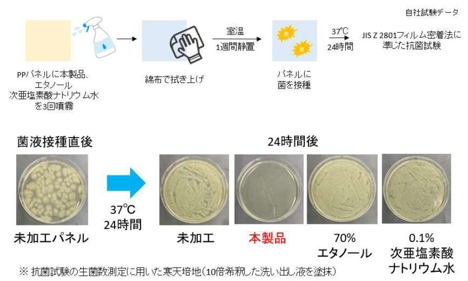 エタノールや次亜塩素酸ナトリウム水を噴霧したパネルは、菌が増殖した様子を確認できますが、本製品を使用したパネルは菌の増殖が抑制されており、噴霧後1週間経過してもパネル表面上に抗菌効果が持続していることが確認できました。