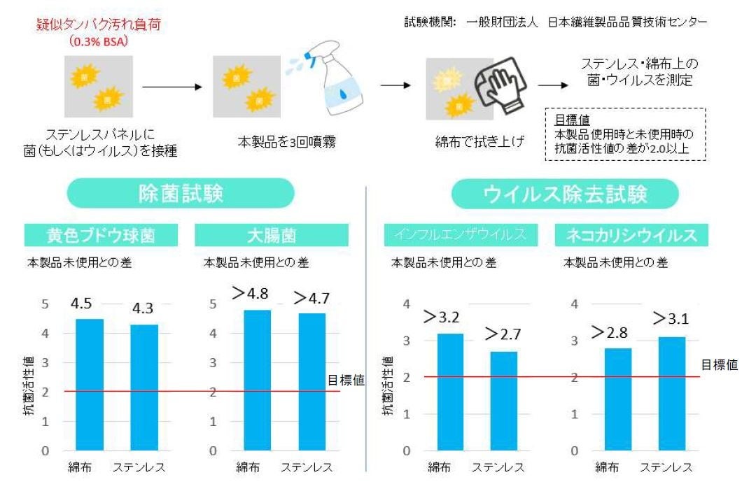 当社がB to B向け製品として販売している持続性抗菌剤「KOBA-GUARD」を配合し、ウイルス・菌を除去するだけでなく、抗菌効果のない対象物表面に抗菌作用を付与することができます。