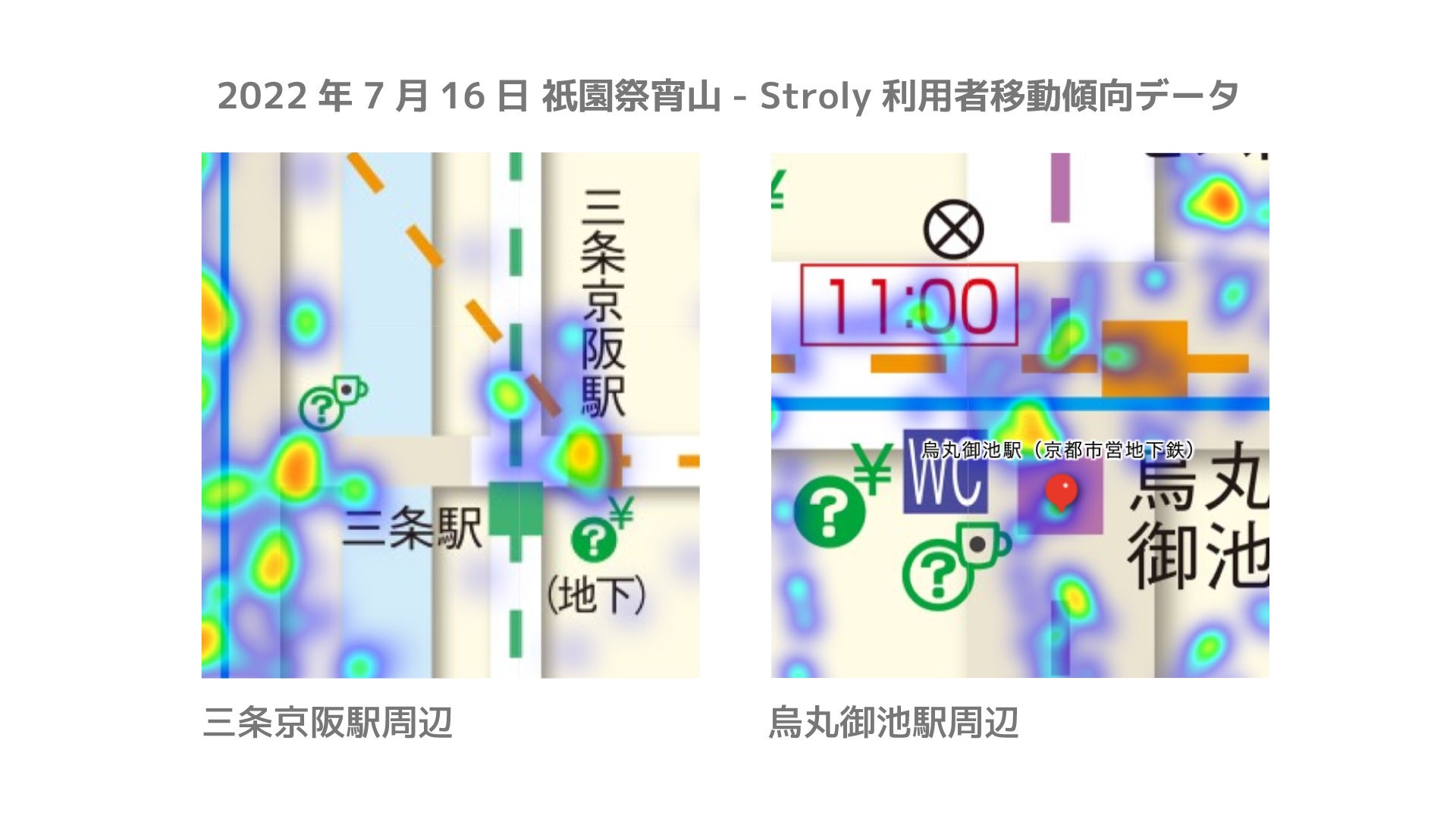 一方で、三条京阪駅(京都市営地下鉄)や、烏丸御池駅(京都市営地下鉄)の利用は比較的少ないことも読み取れました。代表的な最寄駅だけではなく、周辺の駅も分かりやすくマップ上に表示することで利用を促進します。