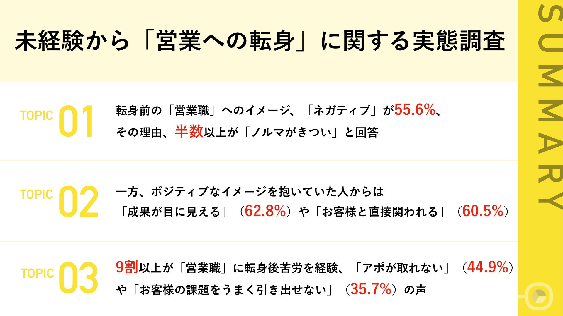 今回の調査では、営業未経験にとって営業職はネガティブなイメージを抱く傾向にあり、営業職に転身が決まった際に不安を感じた経験を持つ人が多いことが分かりました。一方で、営業職の成果が目に見える点にポジティブなイメージも抱かれており、営業職に転身して大変さを感じつつも、自分なりのコツを覚えることで不安を乗り越えられていることが分かりました。営業職は、ハードな仕事のイメージが先行しがちではありますが、コツや基本を覚えることにより、出来る営業として活躍するスピードが早まりそうです。成果が目に見えて分かる営業職だからこそ、コツさえ掴むことが出来ればやりがいを感じて楽しめる仕事と言えるのではないでしょうか。