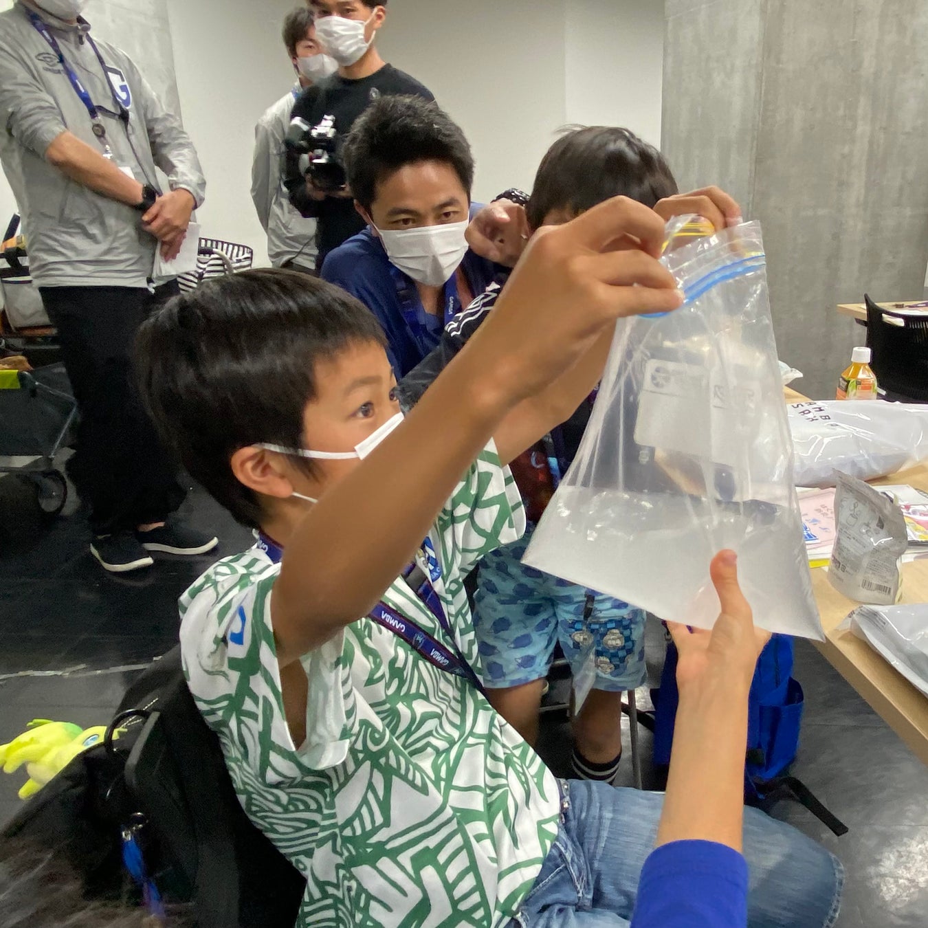 ガンバ大阪主催 サッカースタジアムで防災について学ぶサンコー「ガンバ大阪☆防災キャンプinパナスタ」に参加防災グッズの展示・凝固剤が固まる実演を行いました。