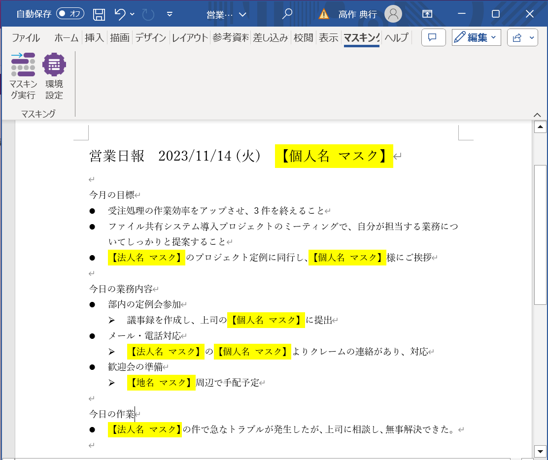 Wordファイル マスキング画面イメージ