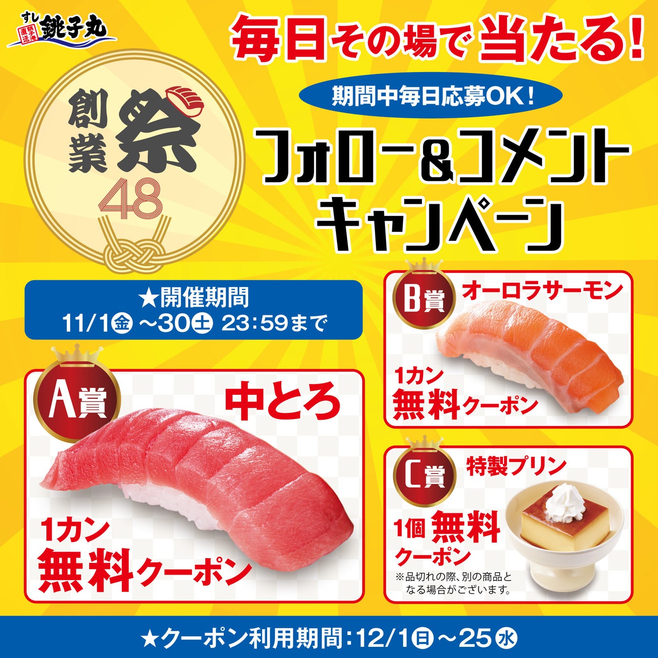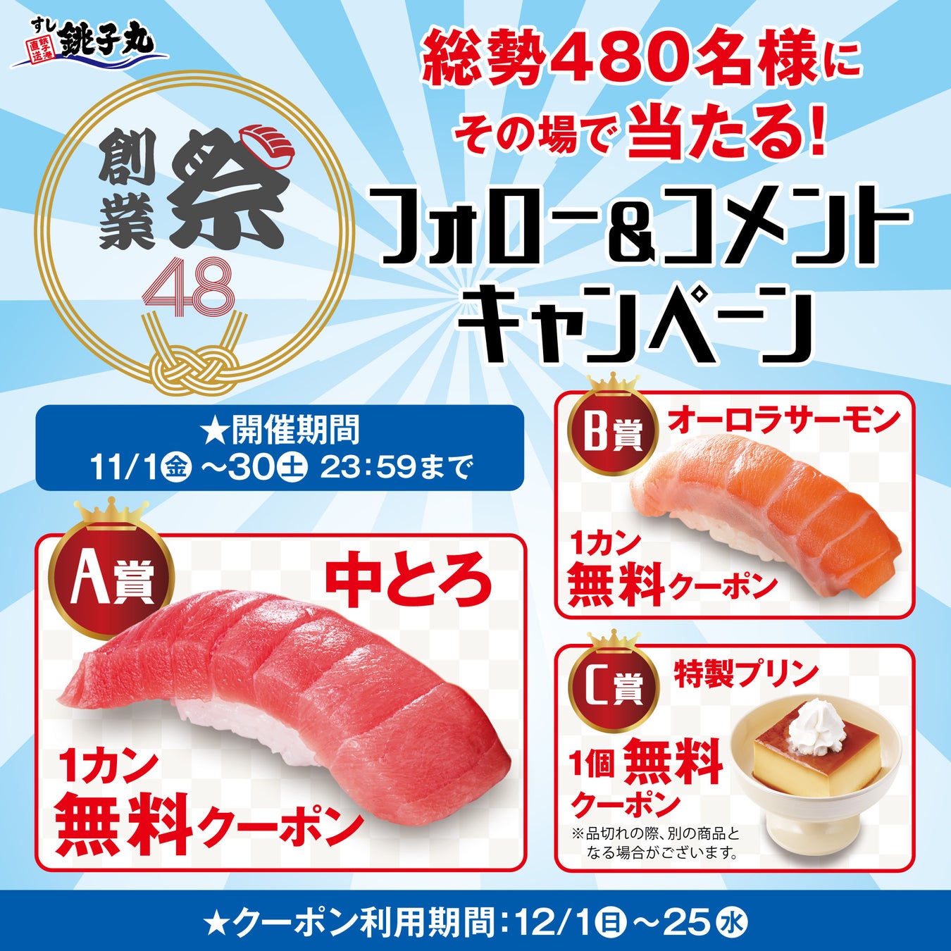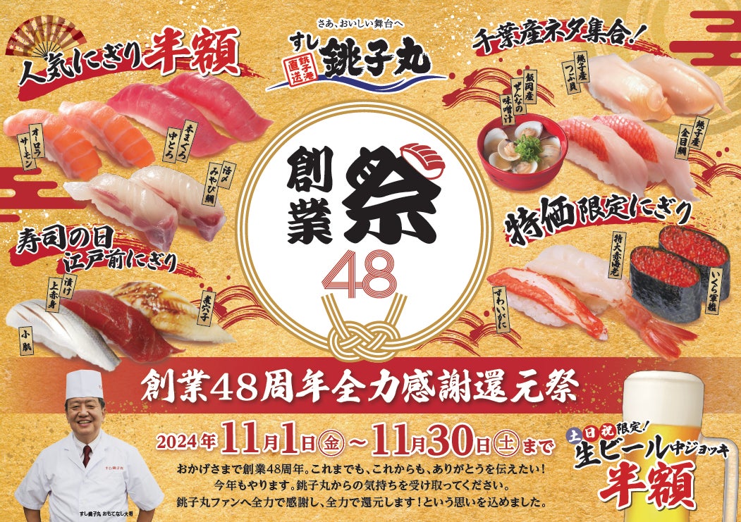 すし銚子丸では創業48周年を記念して、2024年11月1日より一カ月間「全力感謝還元祭」を開催いたします。