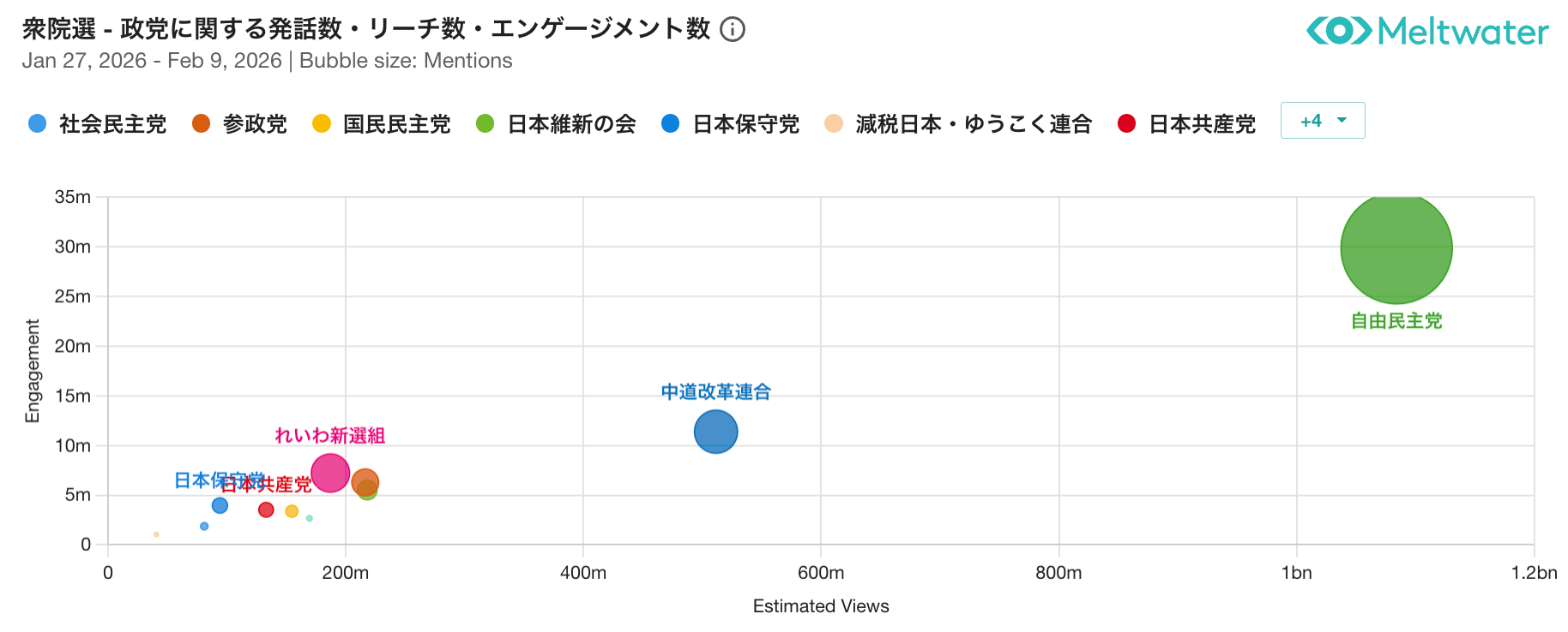 ソーシャルリスニングツールを開発・提供するMeltwater Japan株式会社(所在地:東京都渋谷区、執行役員社長:赤田将之、以下「Meltwater」)は、2026年2月に実施された衆議院選挙をテーマに、SNS上で注目を集めた政党や政策トピックなどを可視化するインタラクティブ・ダッシュボード「SNSデータで振り返る!衆議院選挙2026」を無料公開しました。