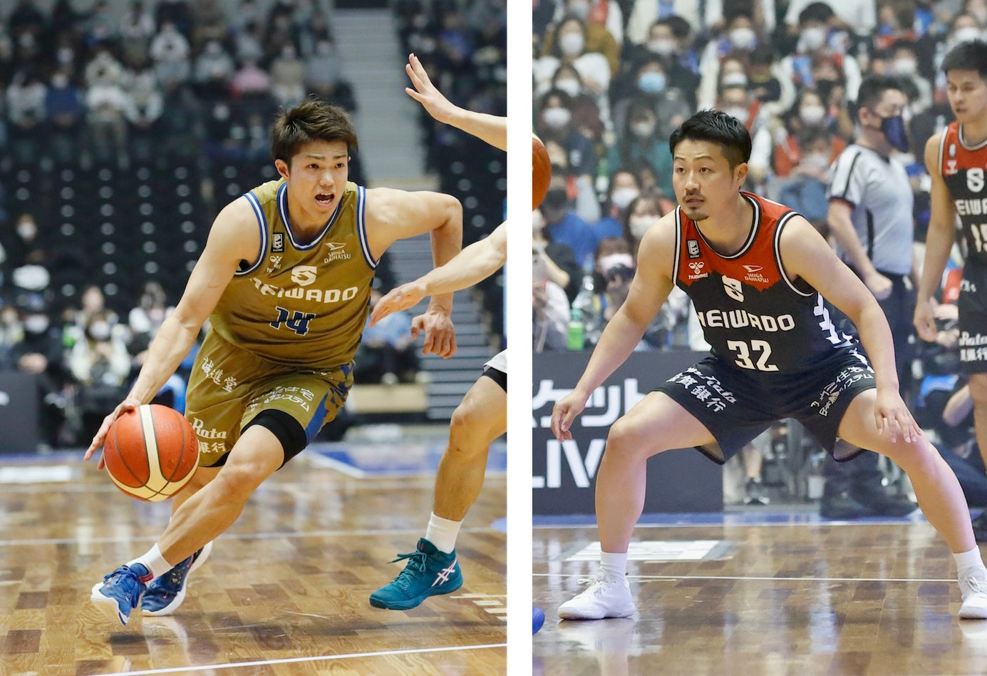 左:#14 柏倉 哲平選手着用「3rd(GOLD)ユニフォーム」、右:#32 狩野 祐介選手着用「NANGAコラボ LIMITEDユニフォーム(RED & BLACK)」※