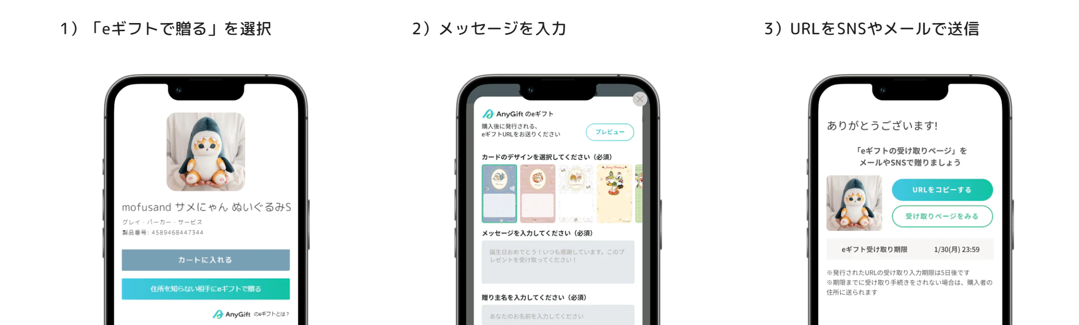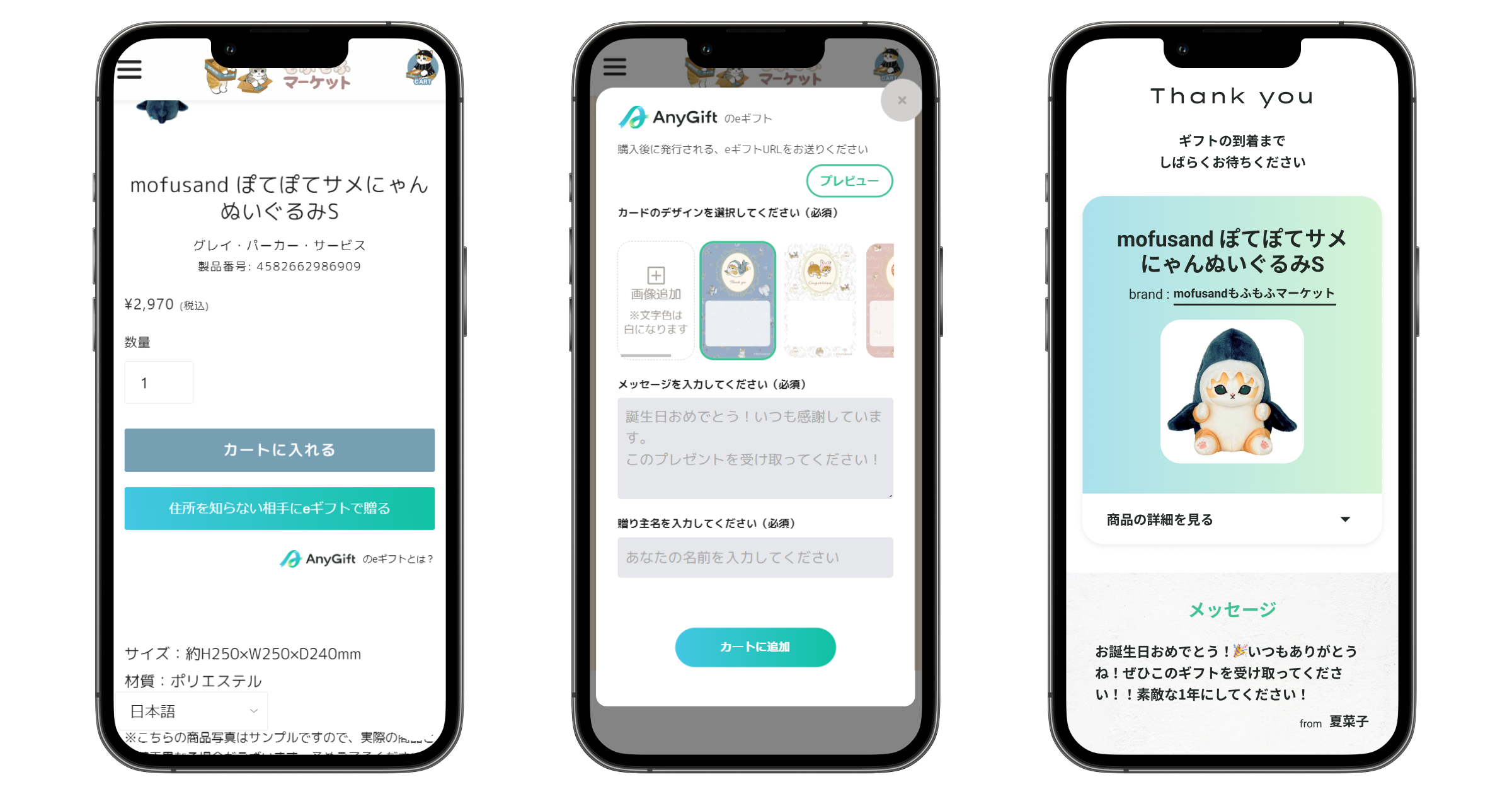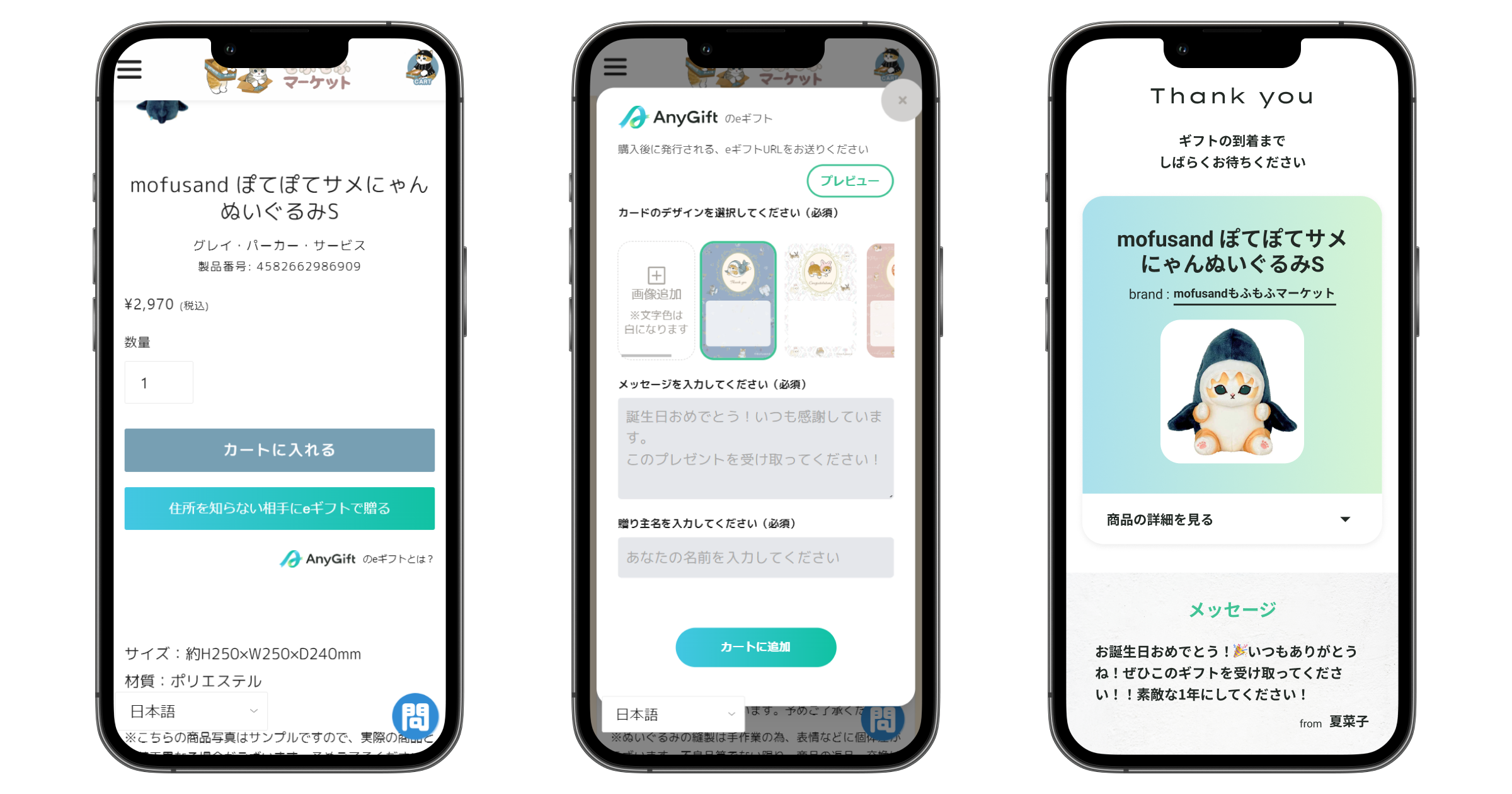 そこでこの度、お客様にもっと気軽に商品をプレゼントとしてご購入していただきたいという思いから『AnyGift』の導入が決定しました。eギフトを通して多くの方に「mofusand」の商品を贈り合う体験を提供できれば幸いです。