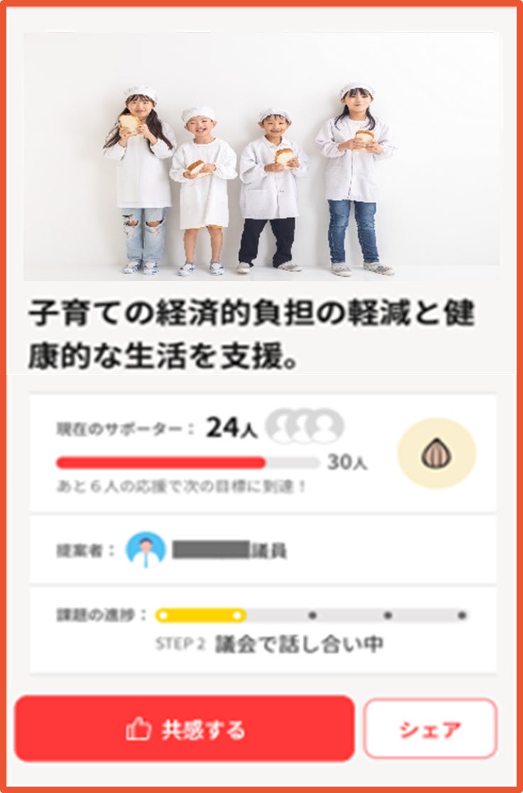 本取組では、議員が自身の活動報告や地域課題に対する考え・政策を発信し、住民が共感ボタンやコメントを通じて参加することで、政治参加のハードルを下げ、地域課題の解決に向けた共創を目指します。