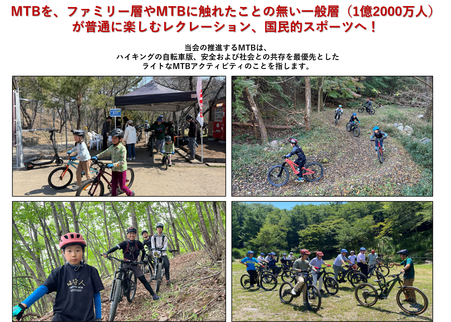 教育にMTB乗車技術を取り入れ、自然との関わりや判断力・自己管理力の育成を通じて、子どもたちの健全な成長やふるさと回帰、自転車交通安全を促進する。