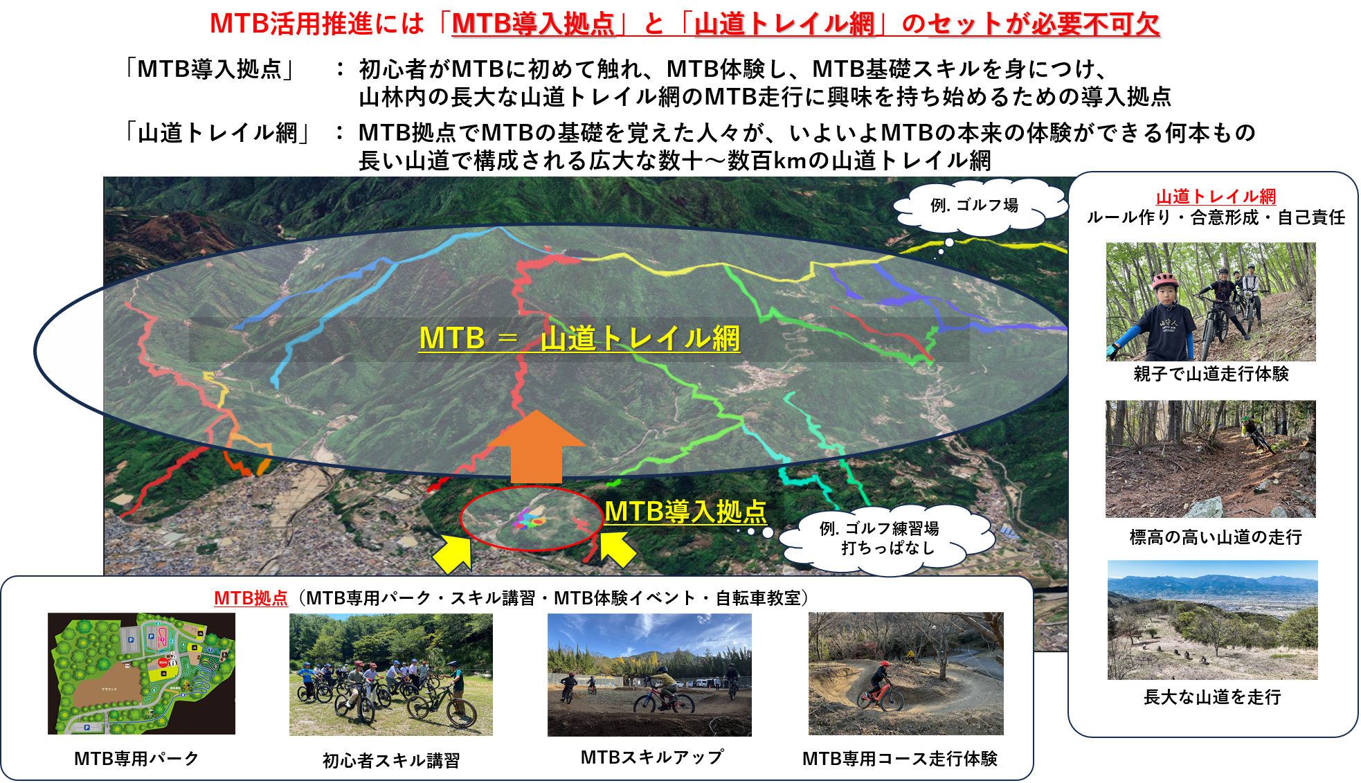 官民が連携し、公共の山道や公共施設の自転車(特にMTB)を含む多様な利活用を促進し、持続的な維持管理が可能となる社会的な仕組みを築く。