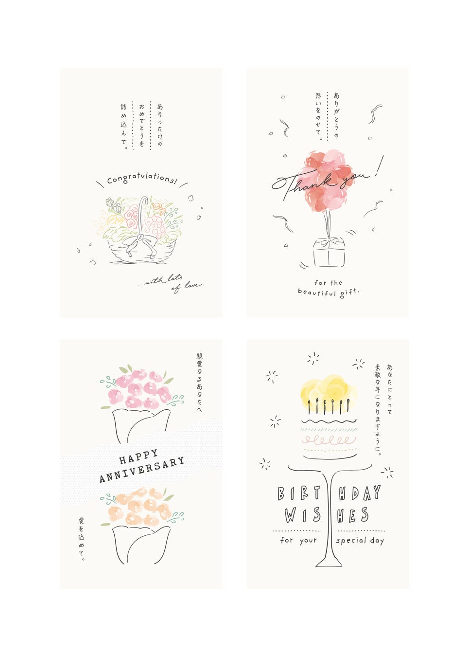 メッセージカードは4種類ご用意しており、ケーキのお渡し時にお好きなデザインをお選びいただけます。大切な方へのお祝いの気持ちを添えて、特別なケーキをより一層華やかに演出いたします。