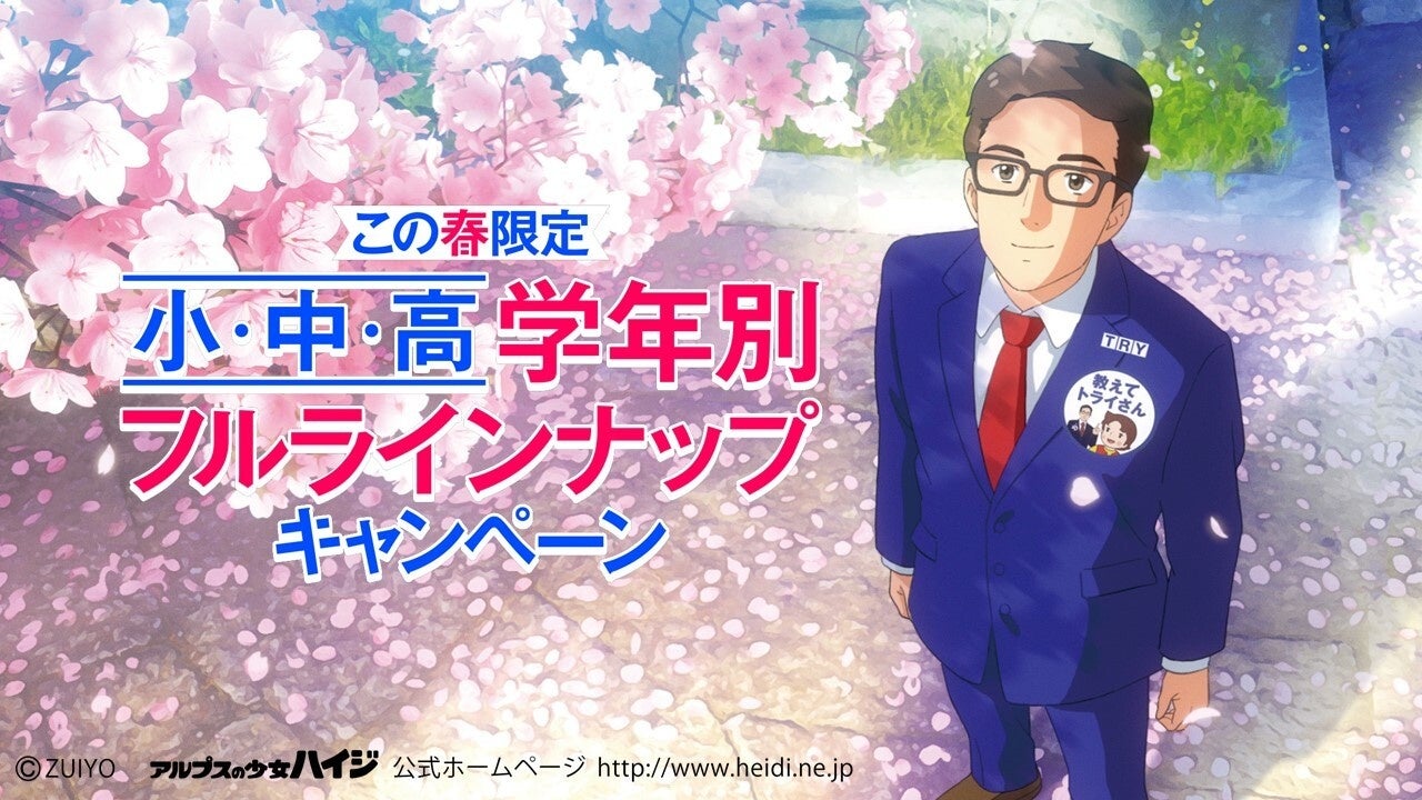 またキャンペーン開始に伴い新CMも公開。トライさんがハイジ・クララに「新学期の準備はどうだい?」「君は一人じゃない」と語りかける姿は、すべてのお子さまに寄り添うマンツーマン教育の温かみを表現。高らかなファンファーレのオリジナル楽曲に乗せてメッセージを届け、新学期への不安や悩みを頑張る勇気へと変える春の応援CMとなっております。