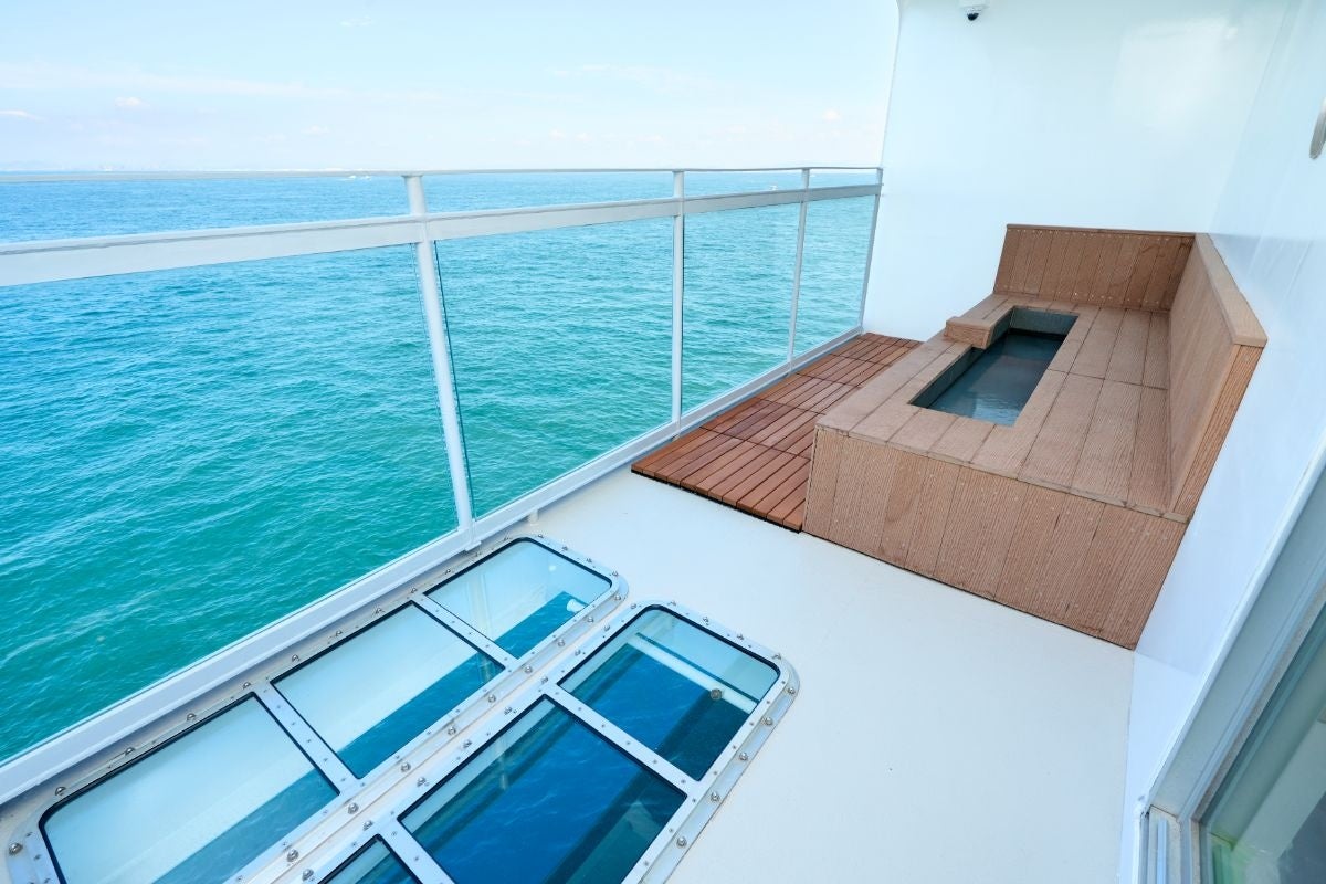 「瀬戸内海に浮かぶテラスリゾート」をコンセプトに、2022年に神戸~小豆島~高松航路に就航しました。天然ウッドデッキのプライベートバルコニーを備えた個室、本物の航海計器で船長気分が味わえる最前方のキャプテンシート、海に飛び出した展望風呂、足湯付きのガラスバルコニー、天然ウッドデッキや芝生広場を備えて明石海峡大橋くぐりが楽しめる「空のテラス」、自動演奏ピアノなど、遊び心あふれる設備が満載です。