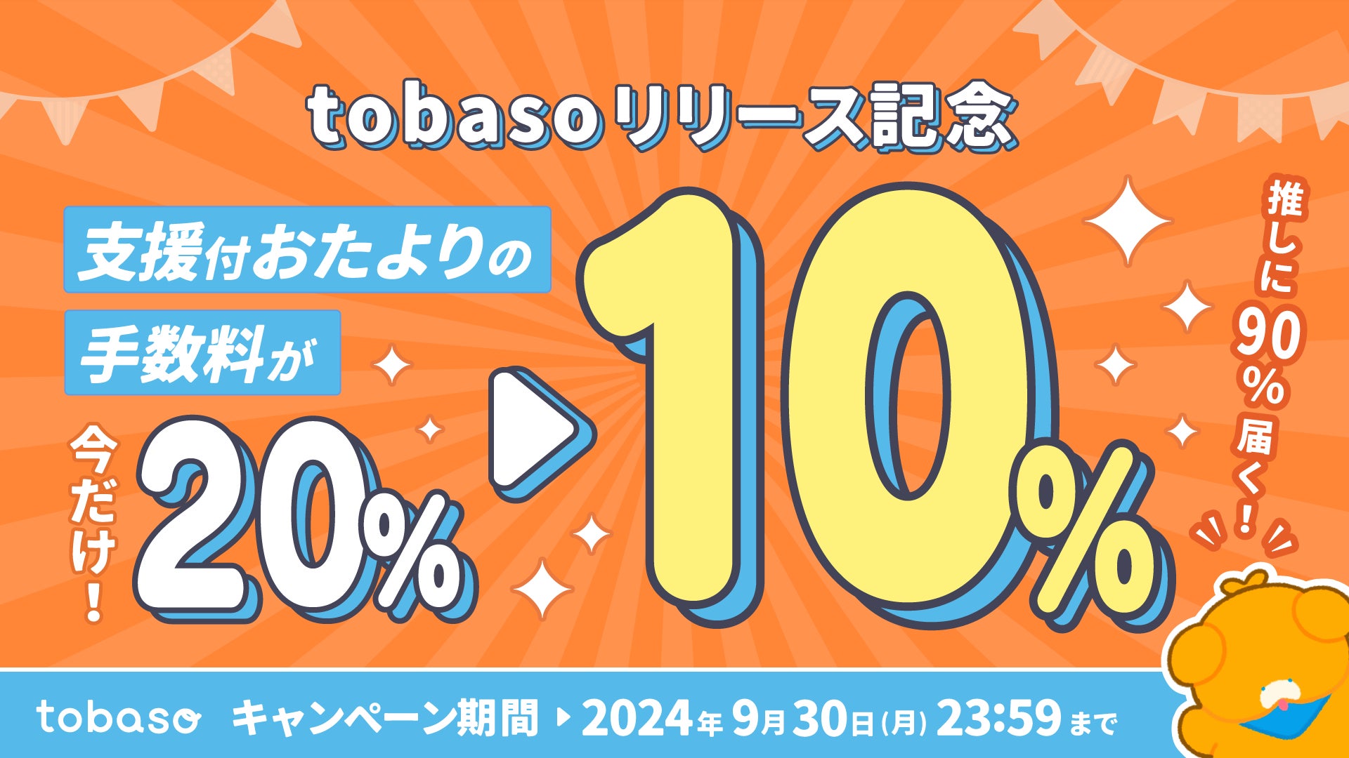 株式会社luco(本社:東京都渋谷区)は、 VTuber配信にぴったりのおたよりサービス『tobaso』の正式リリース記念に、支援金つきおたよりの決済手数料を半額にするキャンペーンを実施いたします。