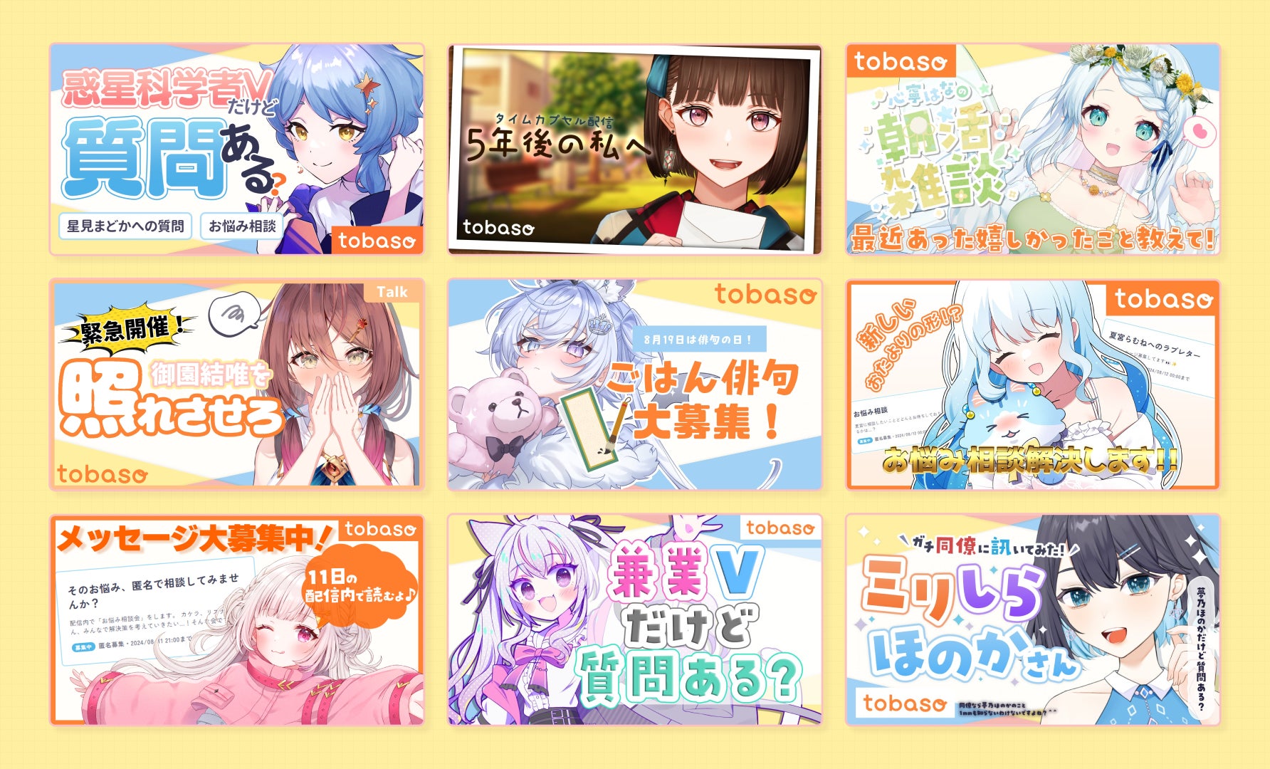 tobasoは、おたより募集型配信やファンレター受付所としての活用はもちろん、誕生日や活動周年記念など特別な瞬間を視聴者とともにお祝いし、視聴者さんとの絆を深めていくことにも最適なツールとなっております。また、動画プラットフォームで収益化ができていない方でも、収益を得る場所として活用することが可能です。