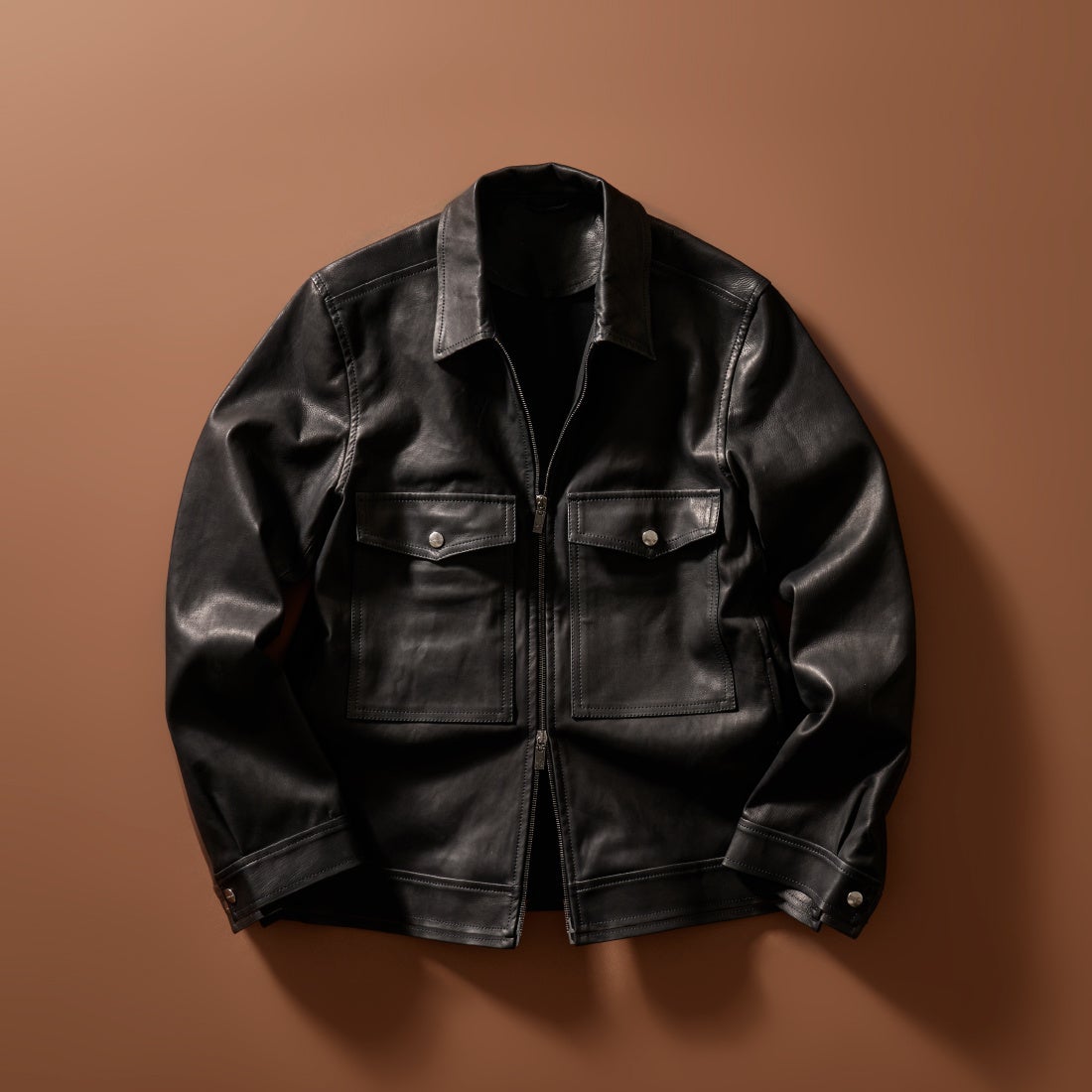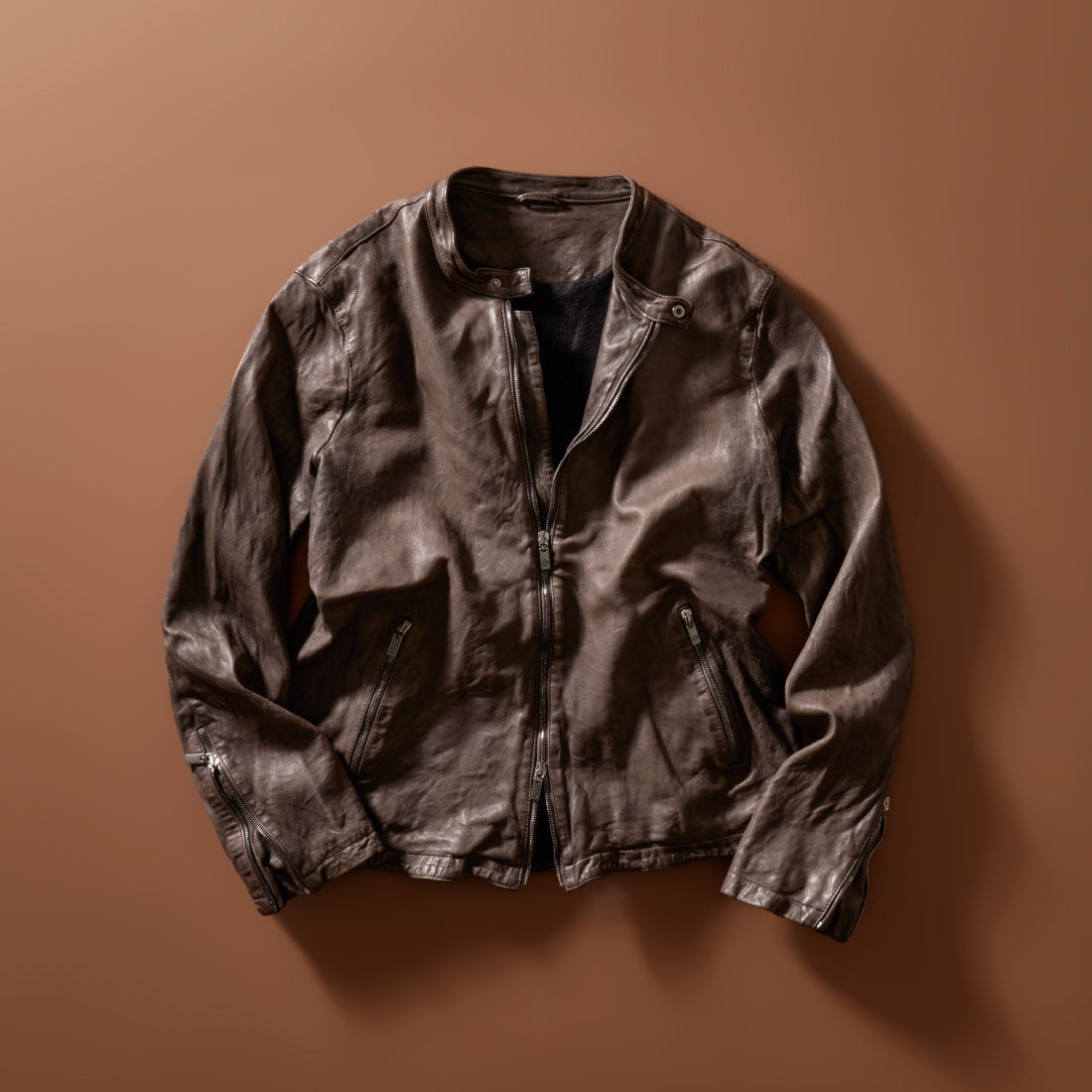 プレーンジャケットはブラック、ミニマルなノーカラーのシングルライダーズジャケットは、独特のブラウンで展開します。両アイテムは、使い込むごとに自然な風合い、独特の味わいと色、柔らかくなる性質が特徴的で、自然に変化していく、自分だけの革に育てる経年変化を楽しむことのできるリュクスなアウターです。