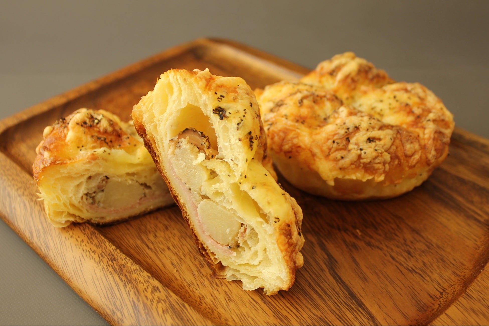 クロワッサン生地に、黒こしょうのきいたポテトサラダとポークパストラミを包み焼き上げました。