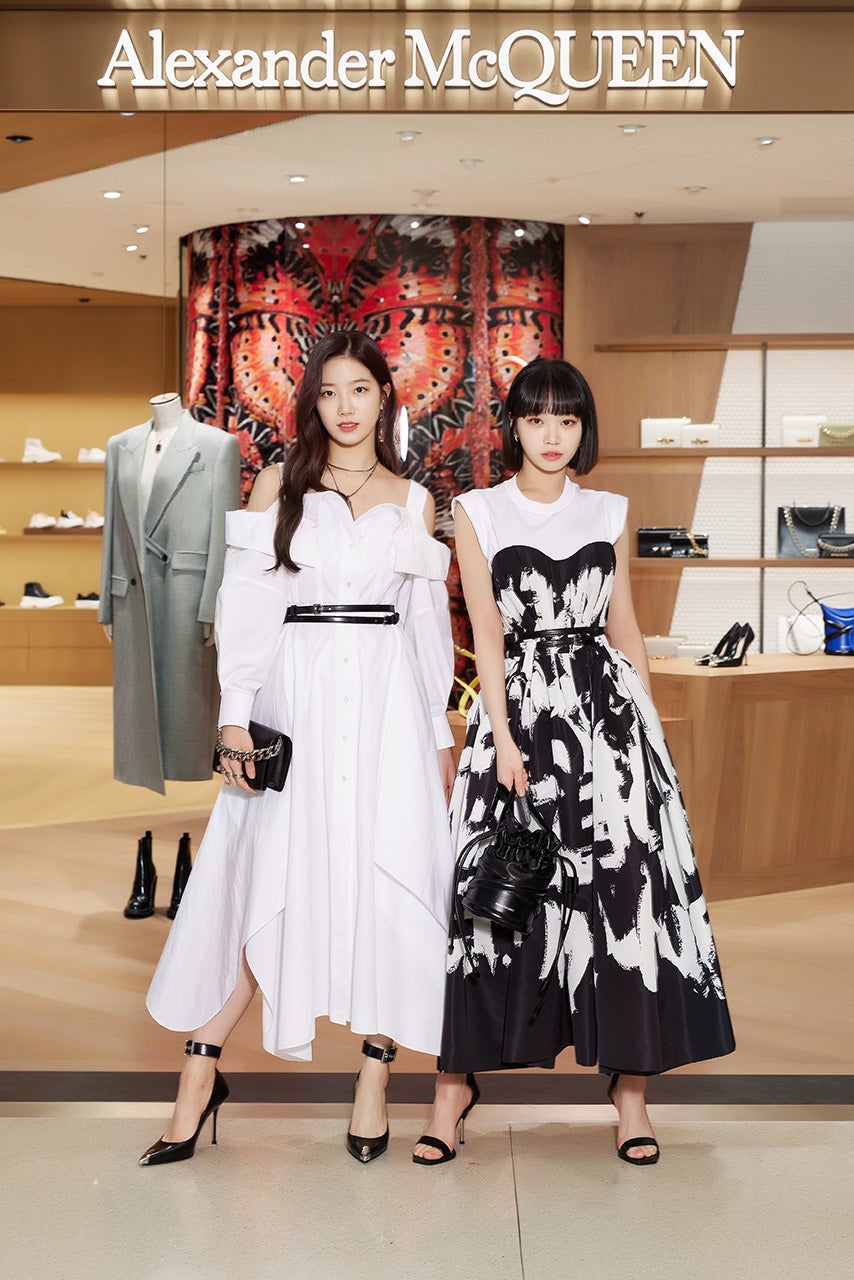 ル セラフィムのメンバーであるKim ChaewonとKazuhaが、2022年秋冬プレフォールよりドレスを着用し、韓国ソウルのロッテ百貨店にリニューアルオープンしたAlexander McQueenの店舗に来場。