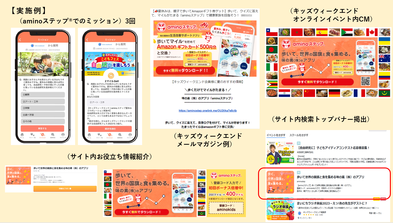 キッズウィークエンド)メールマガジン3種での『aminoステップ®』紹介、サイト内検索トップバナー掲出、夏のオンラインこどもフェス『自由研究を楽しもう』特設サイト内「お役立ち情報」での紹介、オンラインイベントでのCM