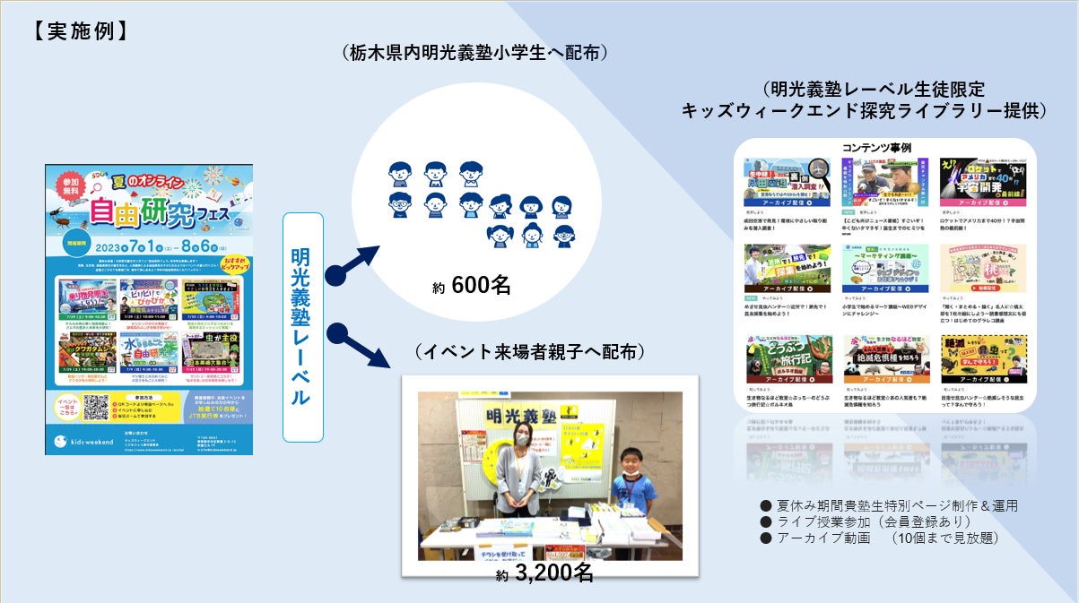明光義塾レーベル)栃木県内小学生生徒様へ夏休み自由研究フェスの告知フライヤー配布(約600名)、県内イベント来場者親子へ同フライヤーの配布(約3,200名)