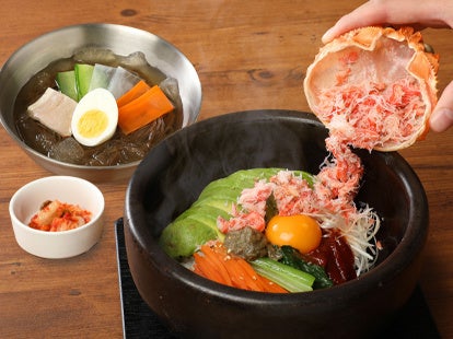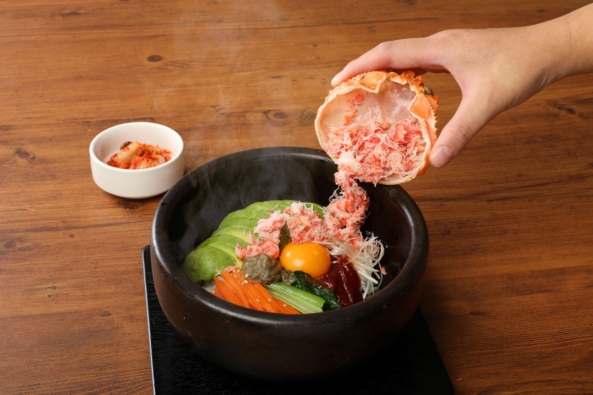 紅ずわい蟹のほぐし身を贅沢に使用した石焼ピビンバ。店内仕込みのナムルとしっかり混ぜると蟹の風味がお口いっぱいに広がります。