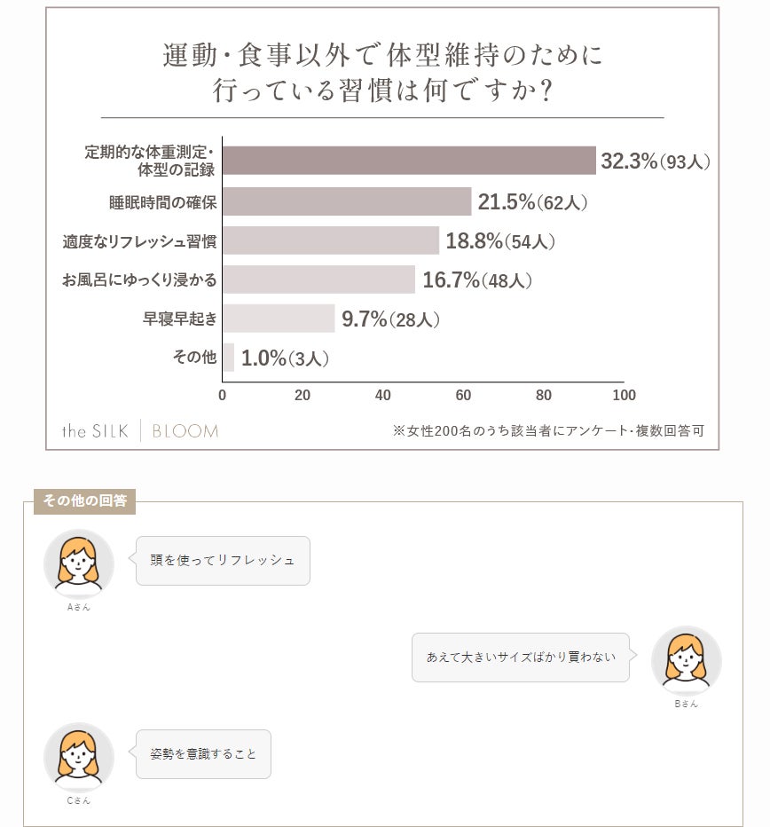200名のアンケート結果によると、体型維持のために行っている運動・食事以外の習慣として「体重測定・体型の記録」が最も多い結果になりました!