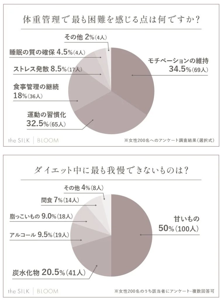 実際に体型維持で最も困難なこととして200名の女性にアンケートをしたところ、モチベーションの維持と習慣化がそれぞれ多数を占めていました!