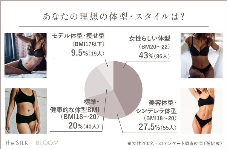 200名の女性がキープしたいと思う理想の体型は「女性らしい体型(BMI20~22程度)」が最も多い結果となり、適度な引き締めと適度な丸みが必要なため油断は禁物です。