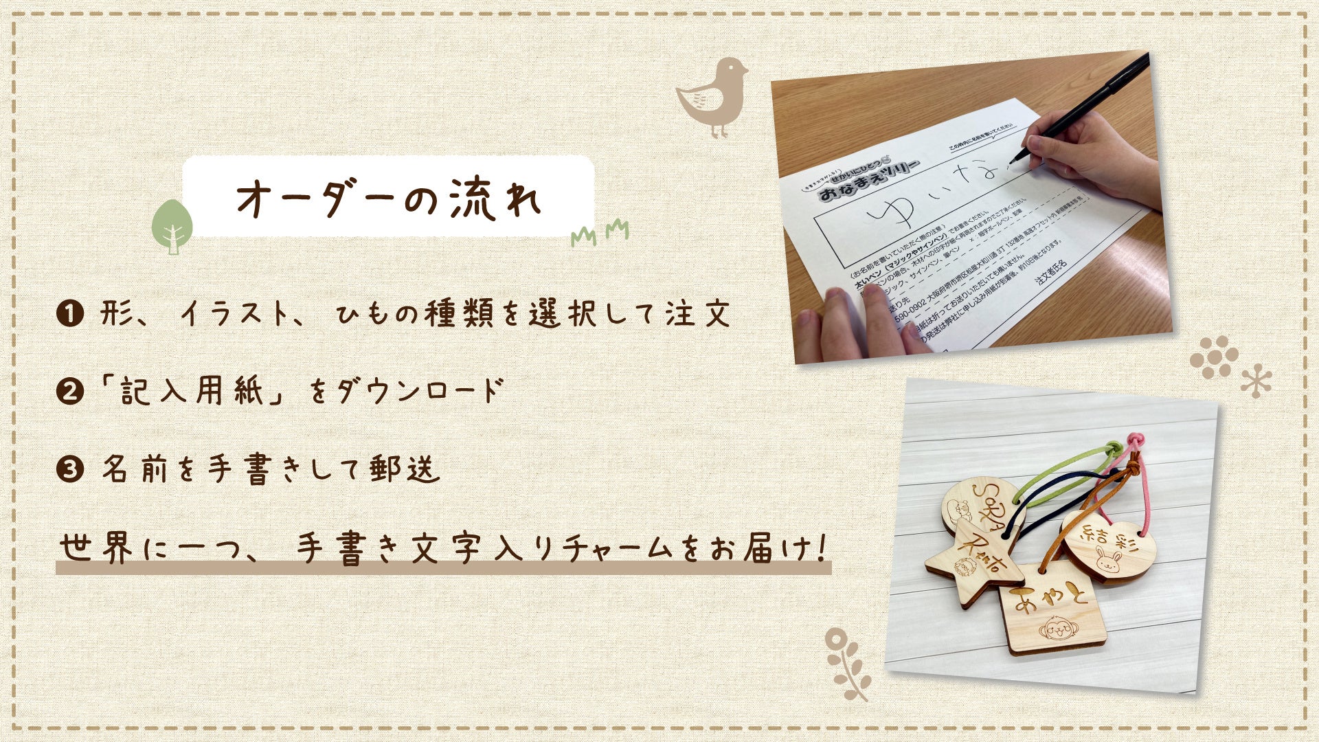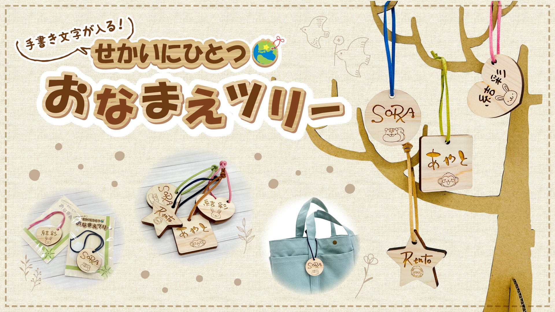 お子さまの手書き文字をヒノキに印字 名入りチャーム「おなまえツリー」を販売