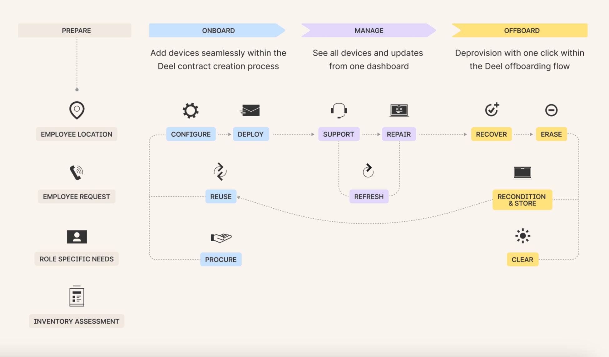 オンボーディングとオフボーディングの効率化 新規採用時のデバイス設定や、退職時のデバイス回収といったオンボーディング・オフボーディングのプロセスが簡略化されることで、人事担当者や管理者の負担が大幅に軽減されます。Deel ITがこれらのプロセスを迅速に対応するため、従業員が即座に業務を開始できる環境を提供します。