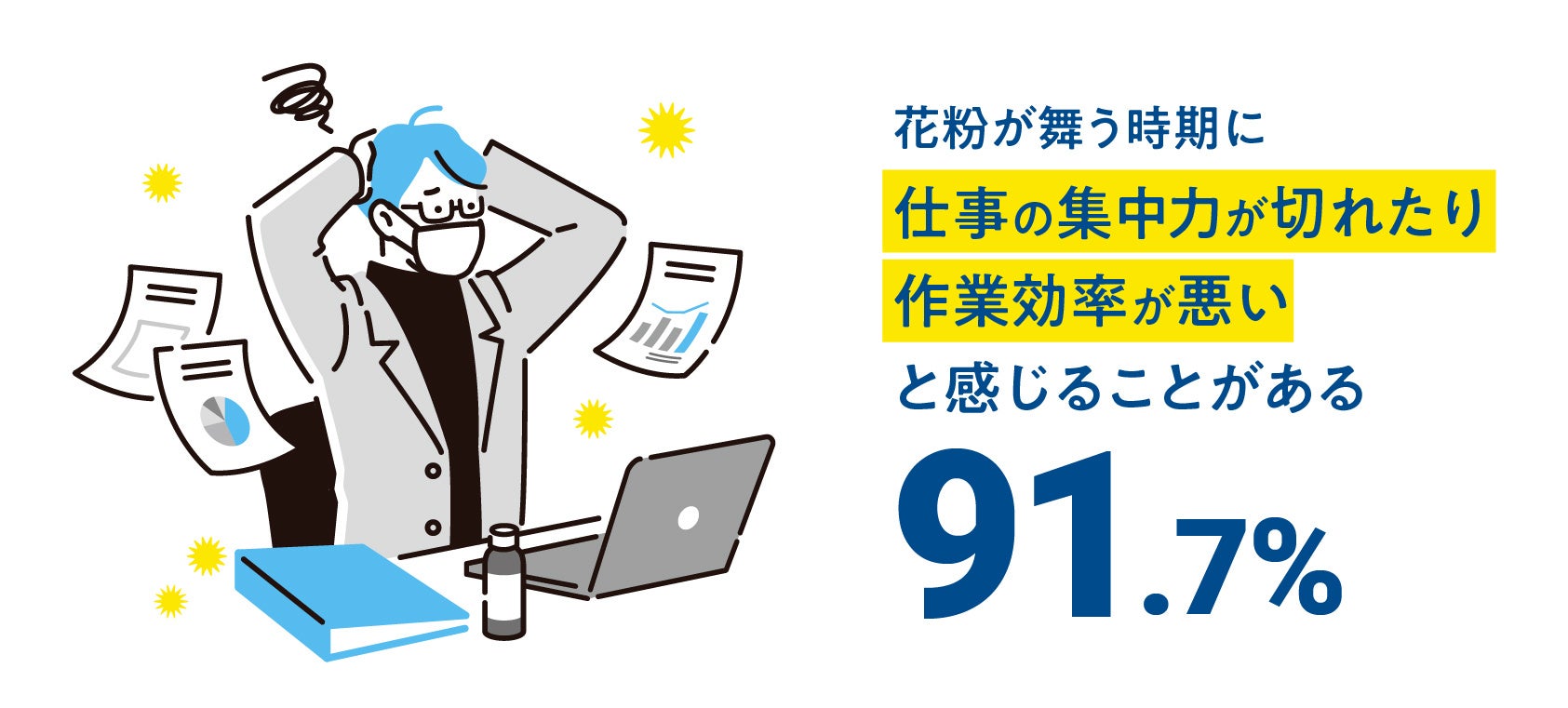 花粉が舞う時期に仕事の集中力がきれたり作業効率が悪いと感じている人は9割以上であることがわかりま